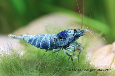Caridina cf. cantonensis – Blue Bolt gehört zur Familie der Atyiden. Sie wird meist fälschlich mit Caridina cantonensis verwechselt. Ihre systematische Einordnung ist umstritten, was in der Literatur oft angemerkt wird. Ihr Körper misst im Schnitt etwa 2,5 cm. Die Schale ist zart und mit einem strahlenden blauen Farbton versehen. Die grauen und blauen Schattierungen verlaufen in sanften Übergängen. Die Antennen sind relativ lang und betonen die feine Körperstruktur.