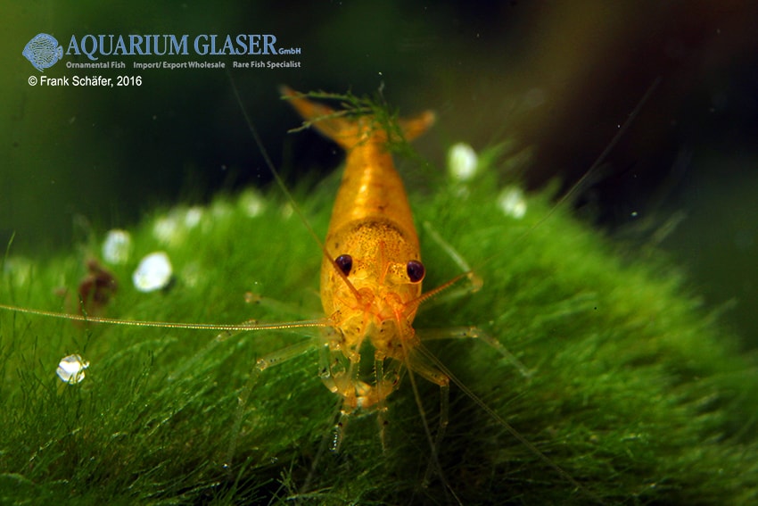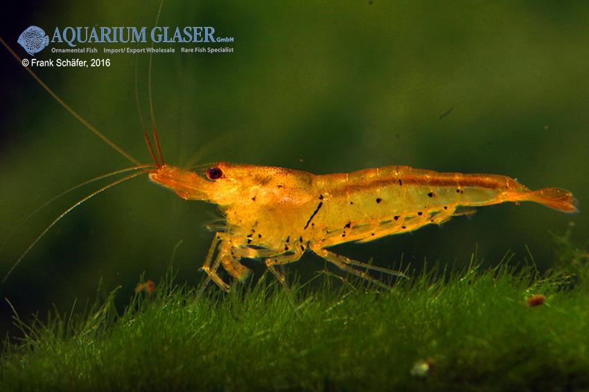Die Garnelenart zeigt eine schlanke Körperform und erreicht durchschnittlich ca. 3 cm Gesamtlänge. Ihr Panzer besticht durch einen dominanten, goldenen Farbton, durchzogen von dunklen Querstreifen, die an ein Tigerfell erinnern. Die Oberfläche des Exoskeletts ist glatt und es gibt keine stachelartigen Erhebungen. Der relativ kurze Rostrum und die gut proportionierten Augen unterstreichen ihr harmonisches Erscheinungsbild. Caridina sp. Golden Tiger besticht dadurch durch eine klare, natürliche Musterung, die sie zu einem attraktiven Objekt im Aquarienbecken macht.