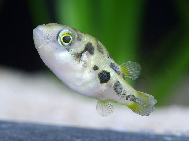 Carinotetraodon travancoricus, Zwergkugelfisch, beeindruckt durch seinen rundlichen Körper und markante Farbzeichnungen. Sein agiles, teils territoriales Verhalten fordert ein abwechslungsreich strukturiertes Becken, das Rückzugsmöglichkeiten und artgerechte Pflege bietet.