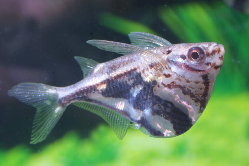 Carnegiella strigata gehört zur Ordnung der Knorpelfische und ist ein kleiner Süßwasserfisch. Der marmorierte Beilbauchfisch zeigt einen silbernen Körper mit dunklen, marmorierten Flecken. Er erreicht im Schnitt etwa 5 cm Länge. Seine Flossen wirken schmal und klar abgegrenzt und sind meist transparent. Er lebt in tropischen Regenwäldern, flachen Bächen und kleinen Flüssen, wo das Wasser warm ist und meist zwischen 24 und 28 Grad liegt. Der Fisch sucht in der Natur schattige Plätze und dichte Vegetation, die ihm Schutz und Nahrungsquellen bietet. Häufig zieht er in lockeren Schwärmen umher, was seine Überlebensfähigkeit in der Gruppe stärkt. Er reagiert schnell auf Licht- und Wasserdruckwechsel und nutzt sein auffallendes Muster zur Tarnung. Im Aquarium braucht er ähnliche Bedingungen, wie lauwarmes, weiches Wasser, ausreichende Verstecke und eine dichte Bepflanzung. Einige Quellen weisen auf regionale Unterschiede in seinem Verhalten hin, was auf eine gewisse Variabilität bei Anpassungen und Vorlieben hindeutet.