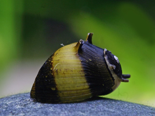 Diese Art (Clithon corona – Zweifarbige Geweihschnecke) lebt in Süßwasser. Sie weist eine markant bunte Schale mit zwei Farben auf. Diese Färbung kann helfen, sich in lichtreichen Gebieten zu tarnen. Ein weiterer Punkt ist der robuste, gewölbte Schalenbau, der als Schutz vor Fressfeinden dient. Die Hülle trägt zudem zur Stabilität in bewegtem Wasser bei. Einige Eigenschaften bedürfen noch genauerer Forschung, um die Anpassungen im Detail vollständig zu verstehen.