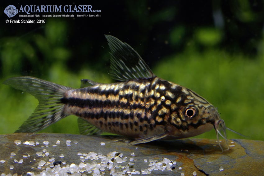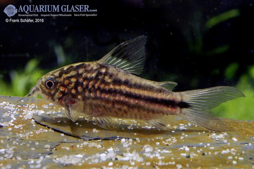 Corydoras sp. San Juan besticht durch eine markante Musterung und einen geselligen Charakter. Der bodennahe Fisch durchstreift den Aquarienboden auf der Suche nach Futterresten und zeigt kooperatives Sozialverhalten. Behutsame Pflege erhält sein harmonisches Erscheinungsbild.