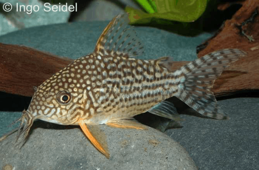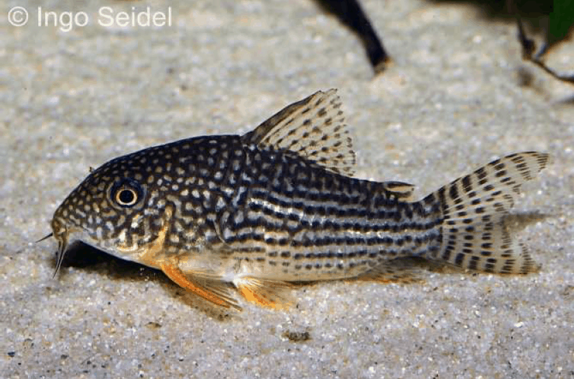 Corydoras sterbai – Gelbflossen-Panzerwels überzeugt durch leuchtende gelbe Flossen und markante Panzerplatten. In Gruppen aktiv, zeigt er ein interessantes Schwarmverhalten und sucht stets schattige Bereiche, während sein geschicktes Futtersuchverhalten das Aquarium belebt.