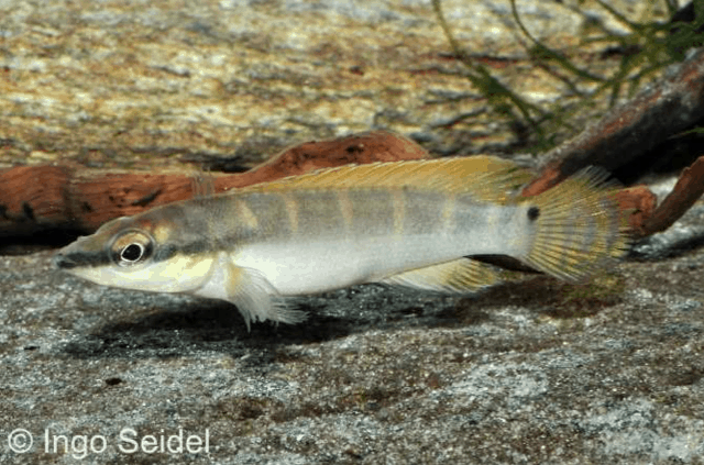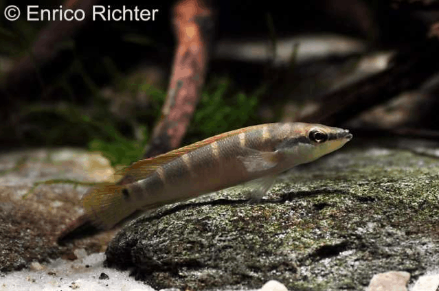 Crenicichla compressiceps, der Schmalkopf-Hechtbuntbarsch, beeindruckt durch schlanken Körperbau und markante Kopfform. Er zeigt lebhaftes Jagd- und Territorialverhalten, agiert dynamisch im Becken und besticht mit eleganten Farbakzenten, die ihn unverwechselbar machen.