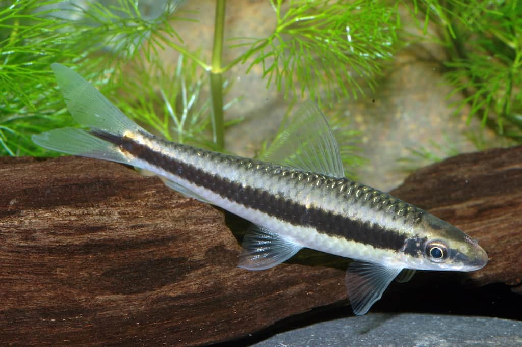 Crossocheilus oblongus – Siamesische Rüsselbarbe überzeugt mit schlanker Form, dezenten Streifen und markantem Rüssel. Aktiv scharrt sie Algen von Oberflächen ab, zeigt geselliges Schwarmverhalten und benötigt ein geräumiges Aquarium mit zahlreichen Verstecken.