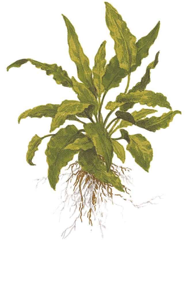 Die Pflanze zeigt lanzettlich geformte, grüne Blätter, die eine leichte Transparenz aufweisen. Die Blätter besitzen eine glatte Oberfläche und zarte, feine Adern. Das Rhizom, ein unterirdischer Spross, ist dick und robust ausgeprägt. Diese Struktur ermöglicht der Cryptocoryne, Nährstoffe effizient aufzunehmen. Die variablen Blattstrukturen bieten sowohl glatte als auch leicht gewellte Ränder, was ihr ein individuelles Aussehen verleiht.