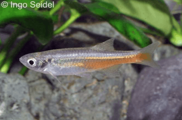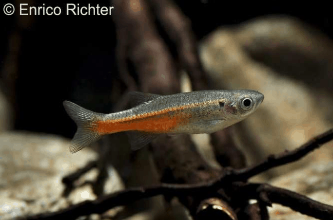 Devario sondhii – Roter Neonbärbling besticht durch markante rote Flanken, feine dunkle Querstreifen und einen schlanken Körperbau. Sein lebhaftes Schwarmverhalten und die flinke Schwimmweise machen ihn zum aktiven Blickfang in artgerecht gestalteten Gemeinschaftsaquarien.