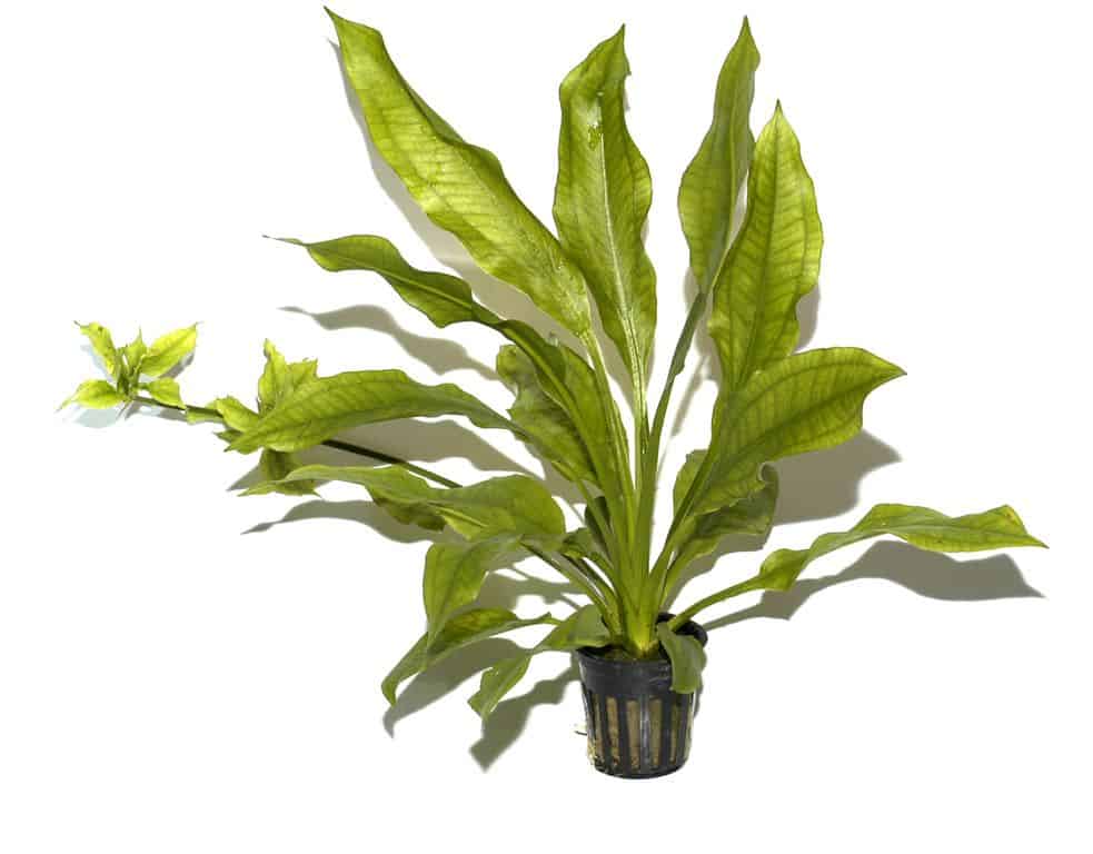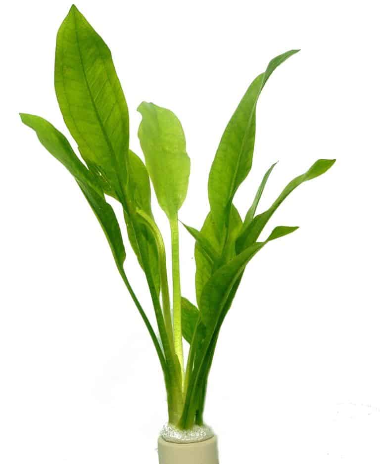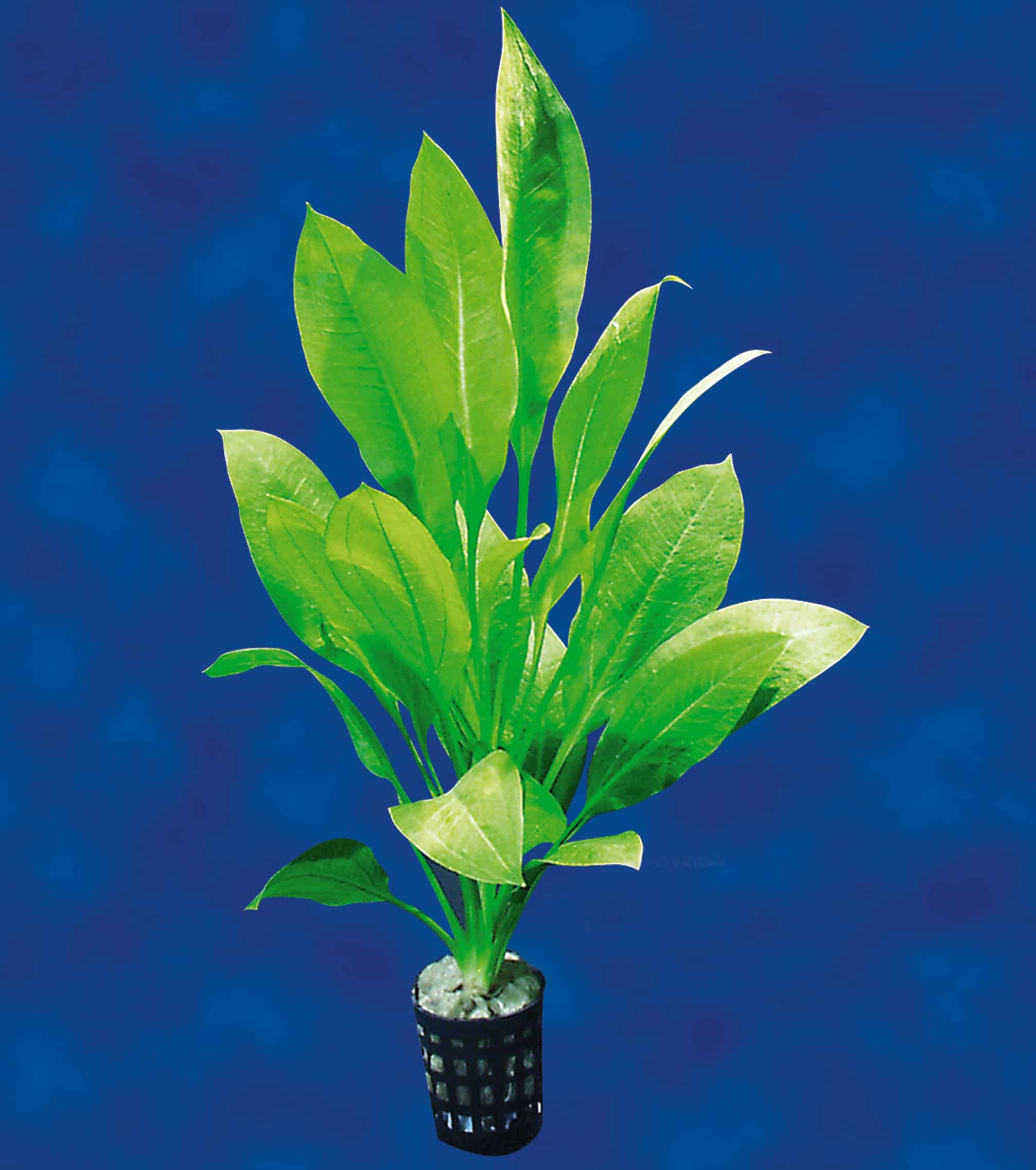 Die Große Amazonas-Schwertpflanze besitzt breite, lanzettliche Blätter mit ausgeprägtem Mittelrippenstrang. Die Blattoberfläche erscheint glatt und zeigt eine gleichmäßige grüne Färbung. Die Blätter wachsen in dichten Büscheln und erreichen eine ausladende Form. Die rosettenförmige Anordnung der Blätter und die robuste Rhizomstruktur sind markante Merkmale. Die Rhizome dienen als Speicherorgan für Nährstoffe und unterstützen den vegetativen Wuchs.
