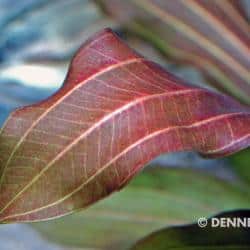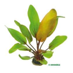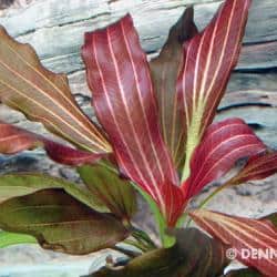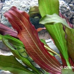 Die Schwertpflanze beeindruckt durch langgestreckte, lanzettliche Blätter. Die tiefrote Färbung der Blattnerven verleiht ihr einen markanten, dekorativen Akzent. Die Blätter zeigen glatte Ränder ohne ausgeprägte Dentikel, was sie von verwandten Arten differenziert. Die schwertförmige Blattbasis schafft eine elegante Silhouette. Die Blattstruktur ist dick, was sie besonders widerstandsfähig gegen mechanische Einwirkungen macht. Diese Eigenschaften sind für den gezielten Einsatz in Aquarien wichtig.