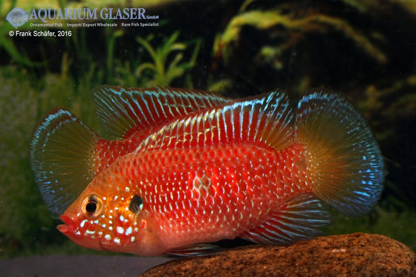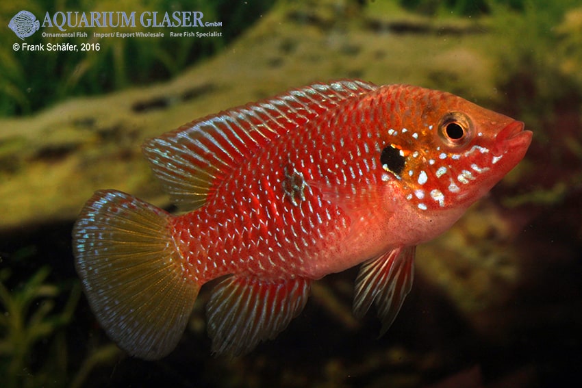 Hemichromis sp. aff. stellifer zeigt ein intensives Rot, ausgeprägte Flossen und ein energisches Sozialverhalten. Der Fisch ist bekannt für seine aktive Revierverteidigung und benötigt kunstvoll gestaltete Rückzugsmöglichkeiten im Aquarium. Es sind keine besonderen Merkmale bekannt.