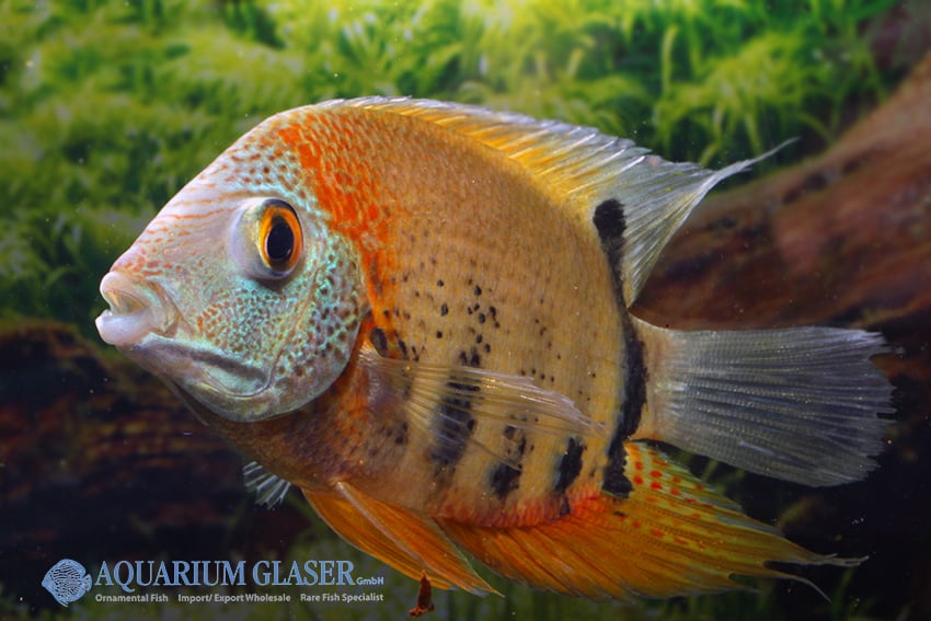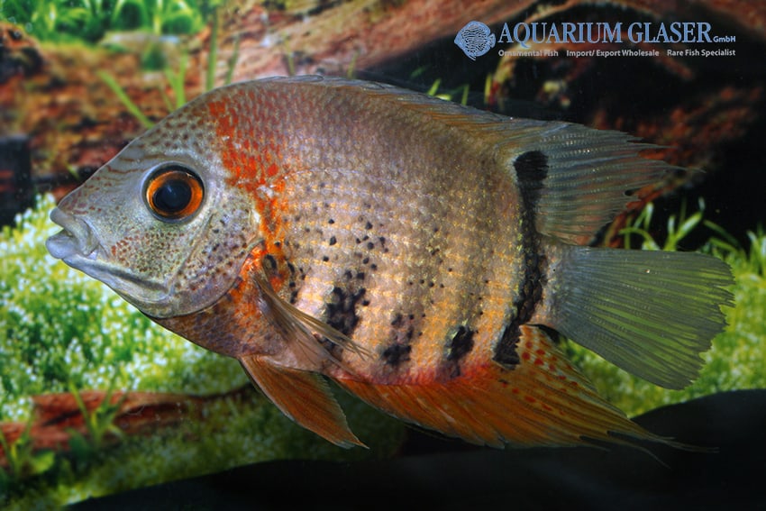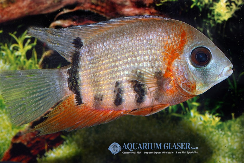 Heros efasciatus zeigt auffällige Farbkontraste und einen roten, keilförmigen Augenfleck. Der Fisch agiert aktiv mit Artgenossen, reagiert neugierig und bleibt zugleich territorial. Seine elegante Körperform sowie lebhaftes Sozialverhalten heben ihn hervor.