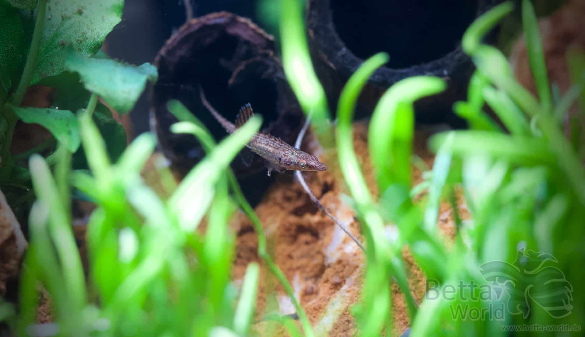 Indostomus paradoxus, bekannt als Burma-Stichling, gehört zur Ordnung der Cypriniformes. Der Fisch zeigt einen schlanken, leicht durchsichtigen Körper mit einer durchschnittlichen Länge von ca. 5 cm. Seine Färbung variiert zwischen silbrig-blau und leicht gräulich, und feine, dunkle Streifen zieren die Flanken. Er lebt in kleinen, ruhigen Fließgewässern und Süßwasserbecken in Myanmar, wo die Wassertemperatur im Schnitt etwa 26 °C beträgt und der pH-Wert leicht sauer bis neutral ist. Zu seinen besonderen Merkmalen zählt eine dämmerungsaktive Bewegung, die in der Natur als Schutzstrategie gegen Fressfeinde dient. Zudem weist er Anpassungen an niedrige Sauerstoffwerte auf, wodurch er in trüben Wasserbereichen überleben kann. Im Aquarium benötigt er behutsam eingerichtete Becken mit vielen Versteckmöglichkeiten, die sein natürliches Habitat nachbilden. Einige Angaben zum genauen Verbreitungsgebiet sind jedoch noch umstritten.