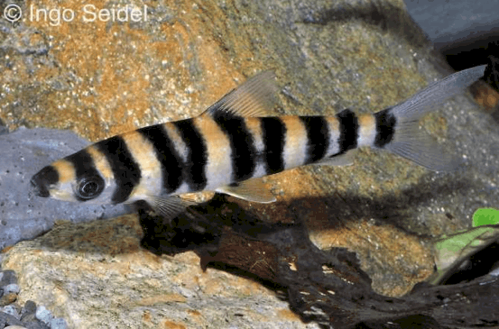 Leporinus cf. tigrinus besticht durch markante Tigerstreifen und ein lebhaftes, aktives Schwimmverhalten. Der Fisch interagiert spielerisch mit Artgenossen und zeigt ein elegantes Äußeres, das ihn zu einem dekorativen Highlight im Aquarium macht. Es sind keine besonderen Merkmale bekannt.