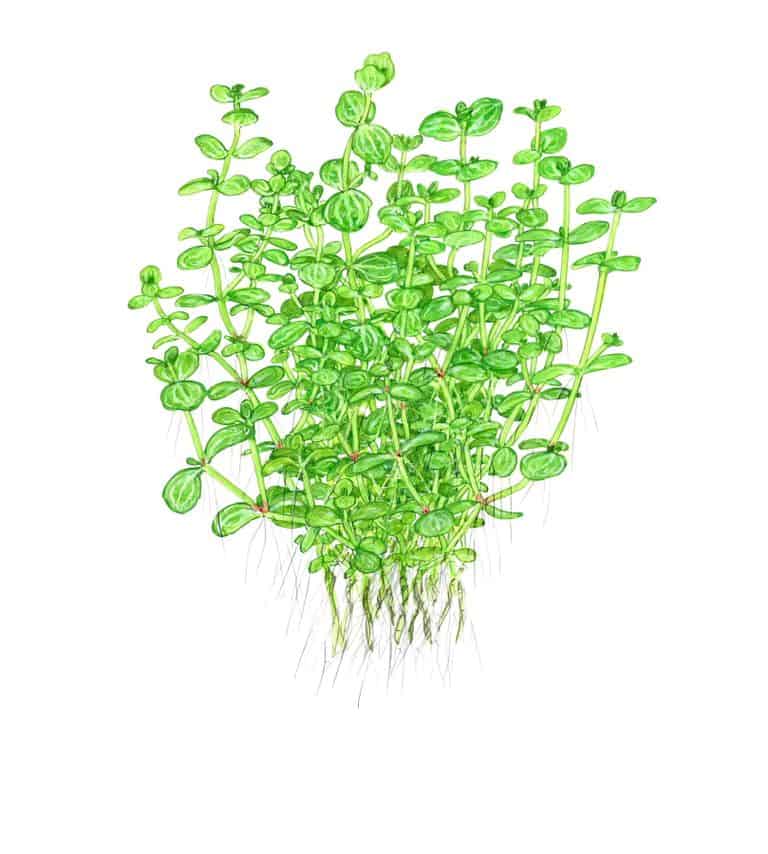 Lindernia rotundifolia ist eine aufrechte Stängelpflanze für den Mittel- bis Hintergrund und bildet keinen echten Teppich im Vordergrund.