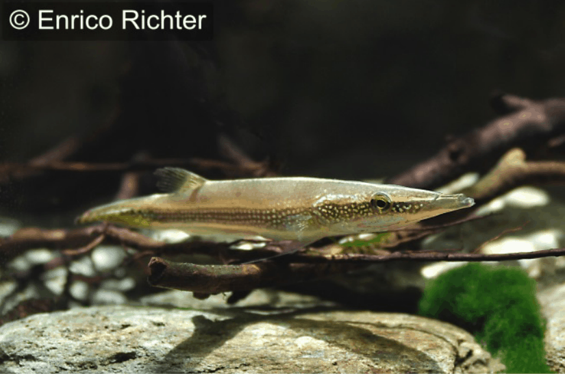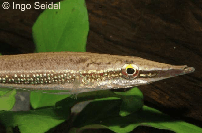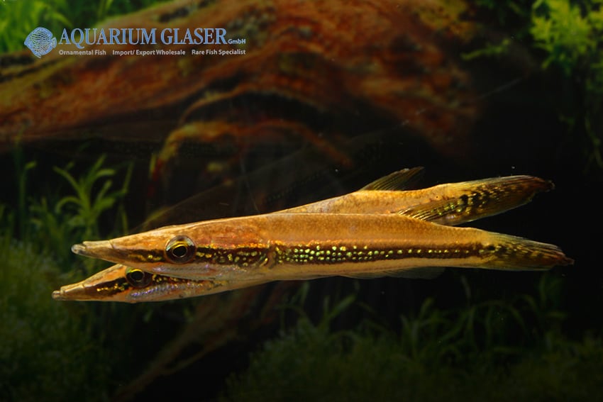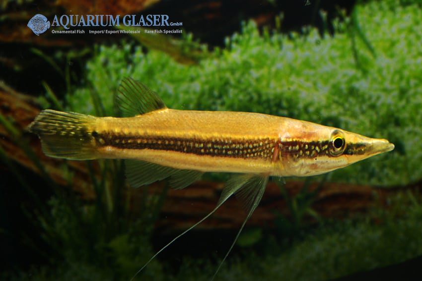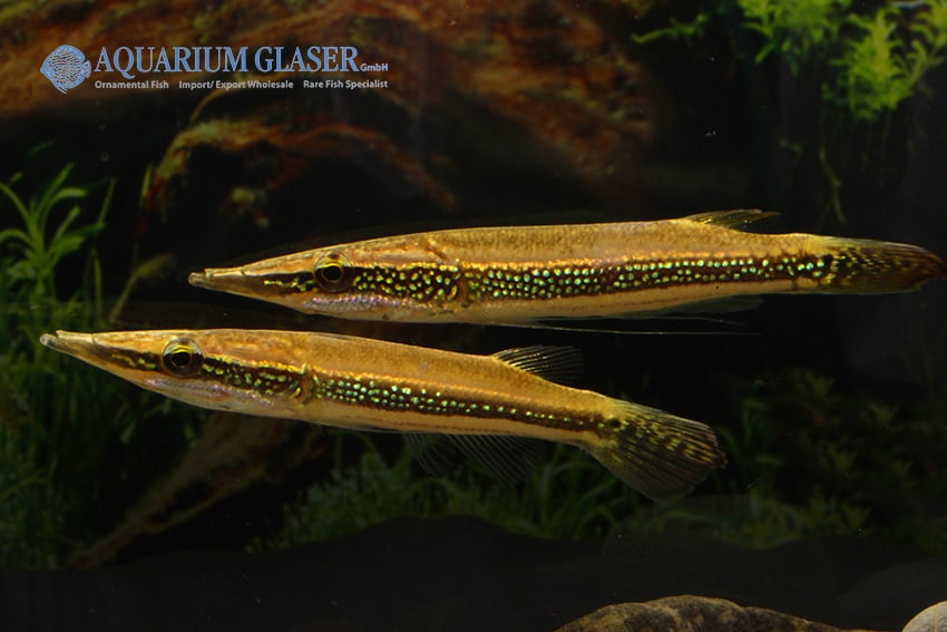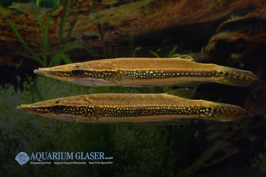 Luciocephalus aura, bekannt als Diamant-Hechtkopf, besticht durch funkelnde Schuppen und einen markanten Kopfumriss. Der aktive Zierfisch zeigt lebhaftes Schwarmverhalten und erkundet neugierig sein Umfeld. Sein außergewöhnliches Äußeres macht ihn zum Highlight jedes Aquariums.