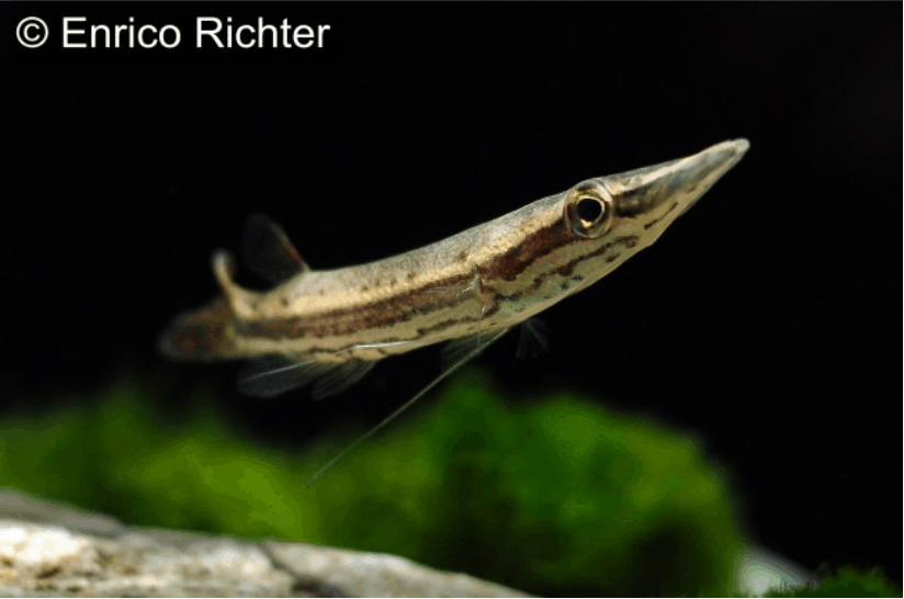 Diese Art ist strikt karnivor, da sie sich in ihrem natürlichen Lebensraum überwiegend von kleinen Fischen und Insektenlarven ernährt; eine reine Pflanzenkost wäre ungeeignet, da sie die benötigten tierischen Proteine und Nährstoffe nicht liefert, während eine ausschließliche Fleischkost ohne geeignete Futterzusätze zu Mangelerscheinungen führen kann. Als Hauptfutter empfiehlt sich ein hochwertiges, fleischhaltiges Trockenfutter, das etwa 70–80 % der täglichen Ration ausmacht. Ergänzend sollte 2- bis 3-mal pro Woche abwechslungsreiches Lebend- oder Frostfutter wie Artemia und Mückenlarven gereicht werden, um das natürliche Beutespektrum nachzuahmen und die Vitalität zu fördern. Die Fütterung erfolgt idealerweise 2- bis 3-mal täglich in Portionen, die innerhalb von 3 Minuten vollständig aufgenommen werden, wobei Futterreste stets zeitnah zu entfernen sind, um Wasserbelastungen zu vermeiden. Da diese Art zu Überfressen neigt, ist auf kontrollierte Portionierung besonders zu achten.