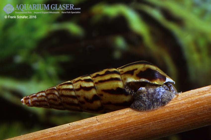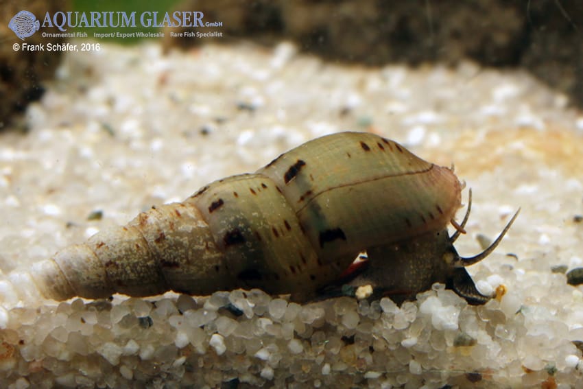 Das Tier hat eine lange, spitz zulaufende Schale mit durchschnittlicher Länge von 25 mm. Die Farbgebung der Schale variiert von hellbraun bis dunkel, oft mit unregelmäßigen Mustern. Die Oberfläche zeigt stachelartige Erhebungen in Form von kleinen Tuberkeln, die vor allem an der Basis auftreten. Die Augen befinden sich auf langen, beweglichen Fühlern und wirken dezent. Melanoides tuberculata ist in tropischen Gewässern zu finden und besticht durch ihre robuste Erscheinung.