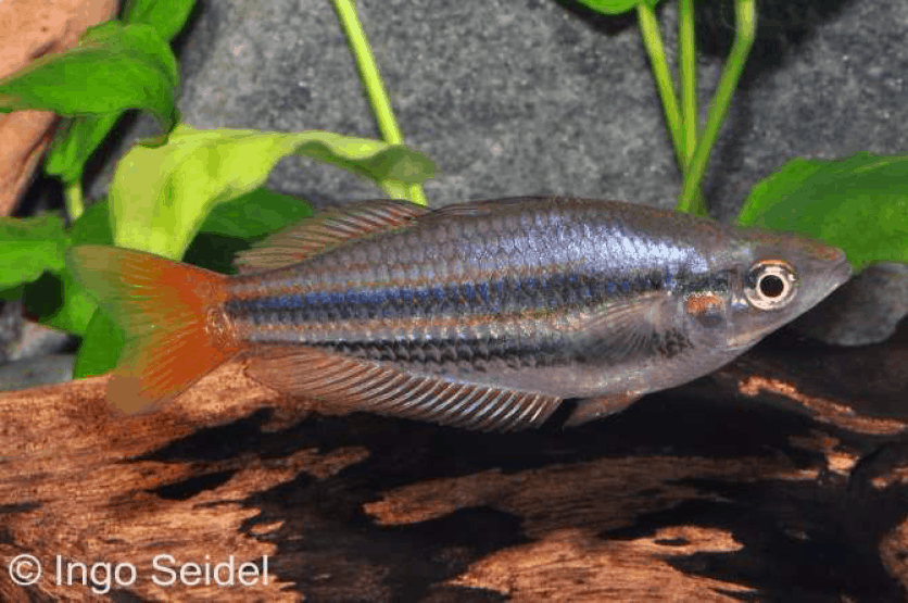 Melanotaenia splendida australis fasziniert mit leuchtenden Flossen in regenbogenfarbenen Nuancen und lebhaftem Schwarmverhalten. Der Fisch zeigt elegante Bewegungen und sozialen Zusammenhalt und ist ein pflegeleichter Blickfang im Aquarium. Es sind keine besonderen Merkmale bekannt.