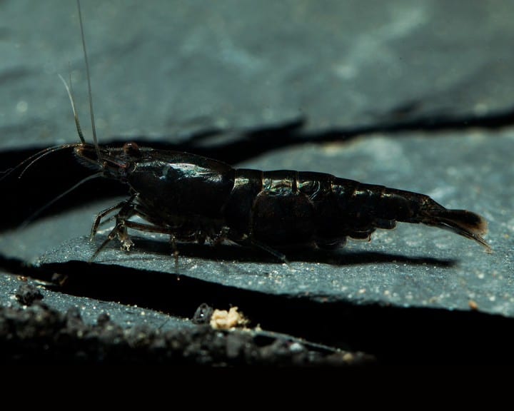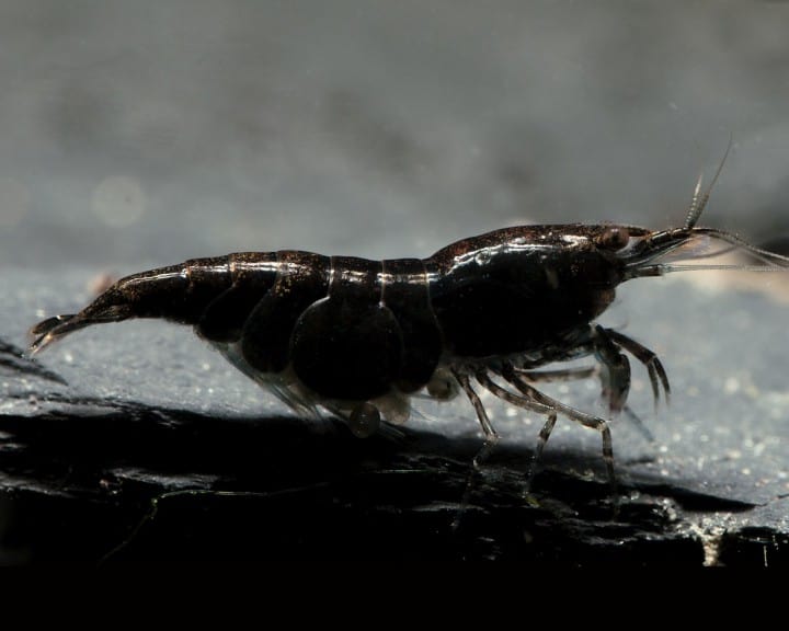 Die Art zeigt einen kompakten, leicht gebogenen Körper, der eine Länge von ca. 2,3 cm erreicht. Der kurze, spitz zulaufende Roggen besitzt keine ausgeprägten Stachel. Die kräftige, einheitliche Färbung in tiefem Schwarz prägt das äußere Erscheinungsbild. Die gut positionierten Augen wirken klar und sind auffällig in ihrer Verteilung. Der robuste Kopf sowie das glatte Abdomen weisen keine weiteren stachelartigen Erhebungen auf. Insgesamt entsteht ein schlichtes, aber charakteristisches Bild, das die typische Struktur einer Zwerggarnele mit hohem Detailgrad widerspiegelt.