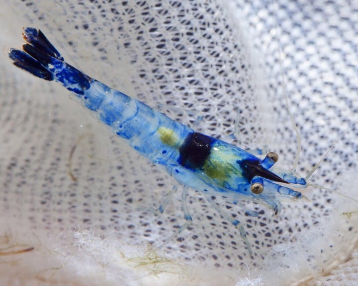 Das Tier zeigt eine auffallende Farbvarianz, die in dieser Garnelenart selten auftritt. Sein Muster aus Blau, Schwarz und hellen Partien beruht auf genetisch bedingter Pigmentierung. Mehrere unabhängige Forschungen belegen, dass das Muster vor Fressfeinden schützt. Der Farbkontrast kann auch auf stabile Gene und selektiven Druck hinweisen. Die genaue Funktion der Musterung ist noch nicht vollständig geklärt, weshalb weitere Untersuchungen über den genetischen Mechanismus notwendig sind.