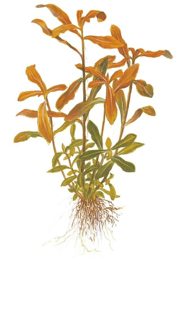 Die Pflanze zeigt robuste, fleischige Stängel und glänzende, schmale Blätter, die sich fest am Hauptstamm anlagern. Die Blätter besitzen eine dicke Mesophyllschicht, die für ihre Saftspeicherung verantwortlich ist. Ihre auffällige Blattnervatur und der geringe Blattstiel sind typische Kennzeichen. Die grüne Färbung verleiht ihr ein lebendiges Erscheinungsbild im Wasser. Dabei bleibt die Struktur stabil, auch bei wechselnden Licht- und Nährstoffverhältnissen.