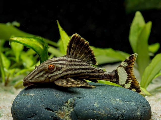 Panaque nigrolineatus (L190) – Royal Plecostomus besticht durch seinen schuppigen, gepanzerten Körper und einen speziell angepassten Mund, der Holz zerkleinern kann. Er zeigt behäbige, nachtaktive Bewegungen und bevorzugt ein strukturiertes Habitat, das Rückzugsmöglichkeiten bietet und so sein natürliches Verhalten unterstützt.