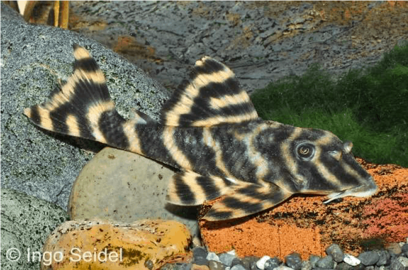 Peckoltia sp. Rio Uatuma beeindruckt durch markantes Streifenmuster, kompakte Körperbauweise und charakteristische Bartlinien. Der nachtaktive Fisch zieht tagsüber in kunstvoll gestaltete Verstecke und reinigt mit seinem Saugsystem den Bodengrund, was ihn in Gemeinschaftsaquarien beliebt macht.