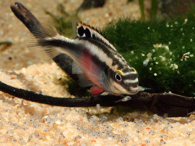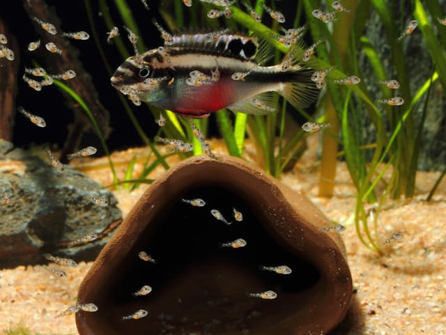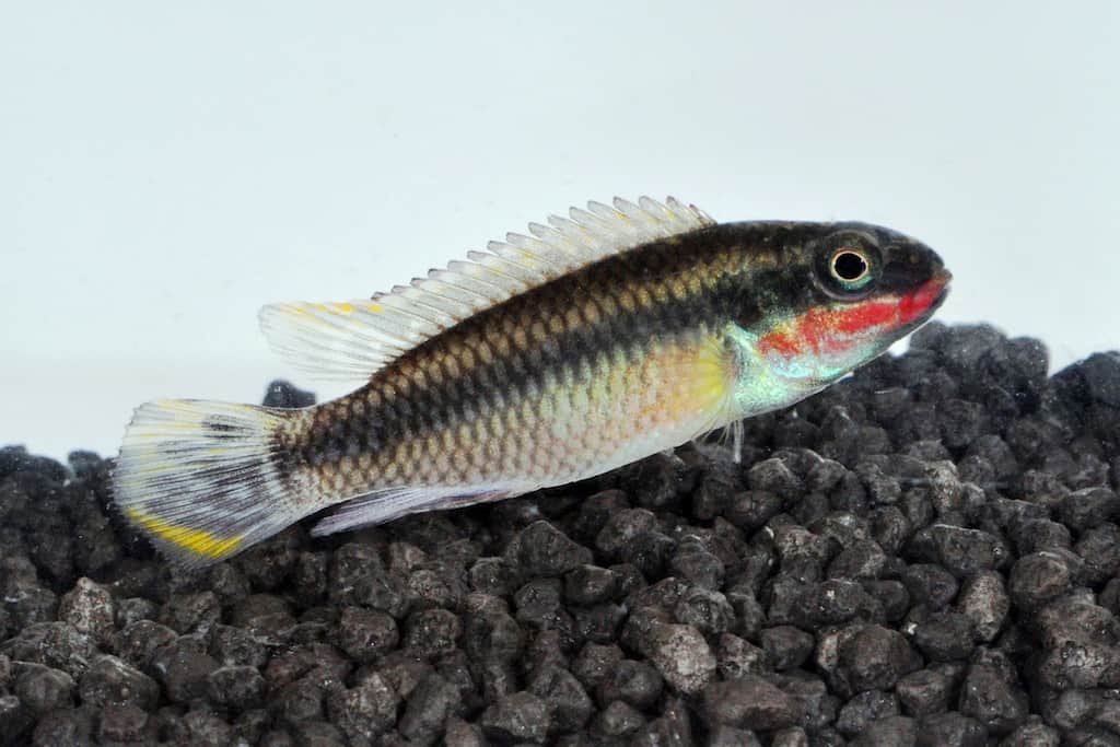 Pelvicachromis pulcher beeindruckt mit intensiven Purpurtönen und einem ausgeprägten Sozialverhalten. Der Purpurprachtbuntbarsch bildet feste Paarbindungen, betreibt engagierte Brutpflege und zeigt charakteristisches Revierverhalten. Sein lebendiges Farbenspiel und die fürsorgliche Haltung der Jungtiere heben ihn deutlich von anderen Zierfischen ab.
