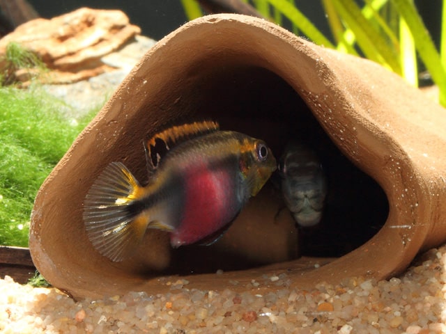 Pelvicachromis pulcher ist ein paarbildender Cichlide, der im natürlichen Habitat in Westafrika meist in monogamen Paaren lebt und gemeinsam mit dem Partner die Brutpflege übernimmt. Für die Aquarienhaltung des Purpurprachtbuntbarschs empfiehlt sich daher die Vergesellschaftung als harmonisierendes Paar, da Einzelhaltung zu Stress und Verhaltensstörungen führen kann, während mehrere Paare in kleinen Becken zu Revierstreitigkeiten neigen. Als Beckenpartner eignen sich ruhige, friedliche Schwarmfische ähnlicher Größe wie Salmler (z. B. Rote Neons, Glühlichtsalmler) oder kleinere Barben sowie friedliche Bodenfische wie Panzerwelse (Corydoras) oder kleine Schmerlenarten, die nicht in Konkurrenz um Reviere treten. Zu vermeiden sind sehr kleine Beutefische wie junge Guppys oder Zwergbärblinge, da diese als Nahrung angesehen werden könnten, ebenso wie aggressive oder sehr lebhafte Arten (z. B. größere Buntbarsche, Sumatrabarben), die die Purpurprachtbuntbarsche stressen oder in der Brutzeit attackieren könnten. Auch langflossige Fische wie Schleiermollys oder Kampffische sind ungeeignet, da Pelvicachromis pulcher gelegentlich zu Flossenzupfen neigt, besonders während der Revierverteidigung.