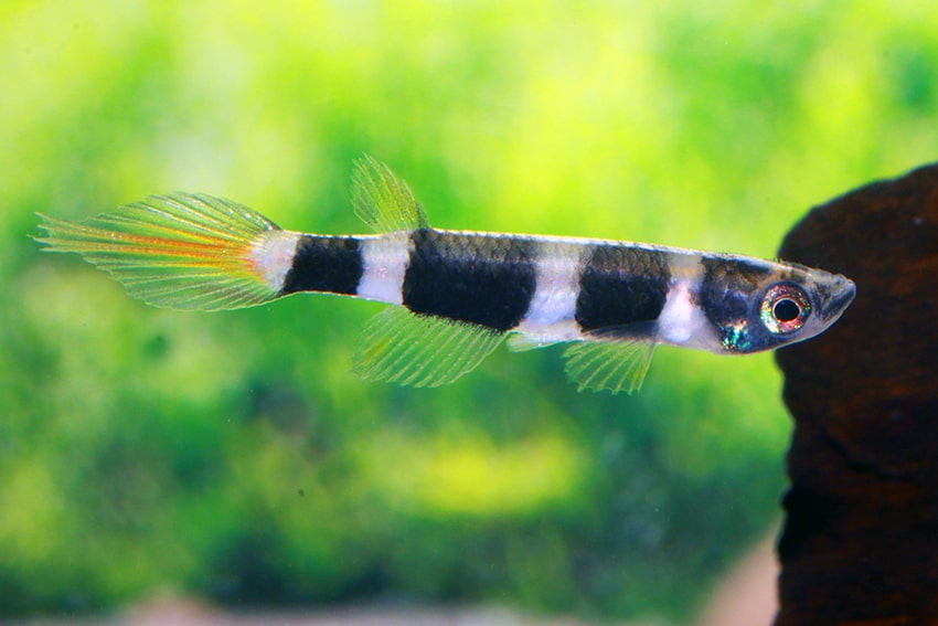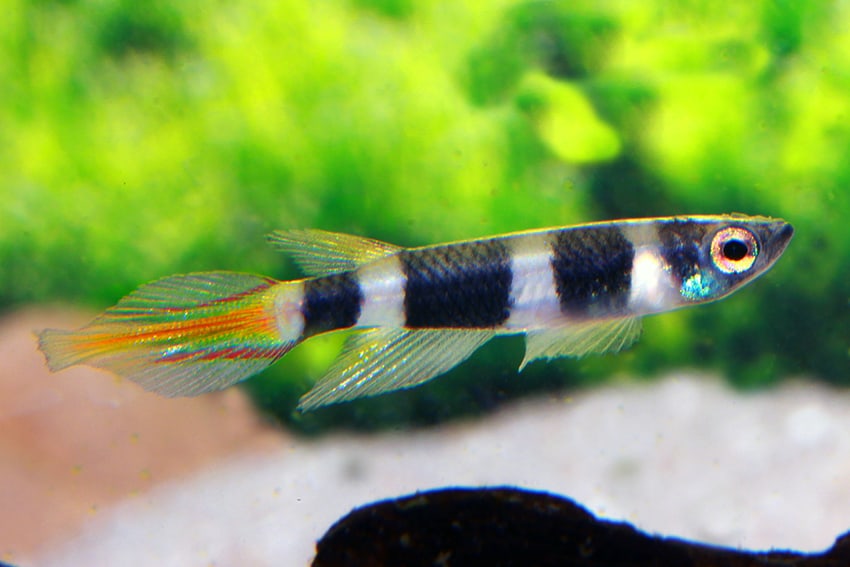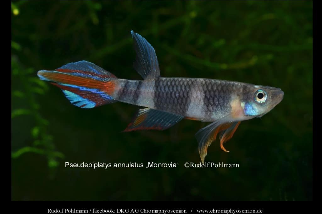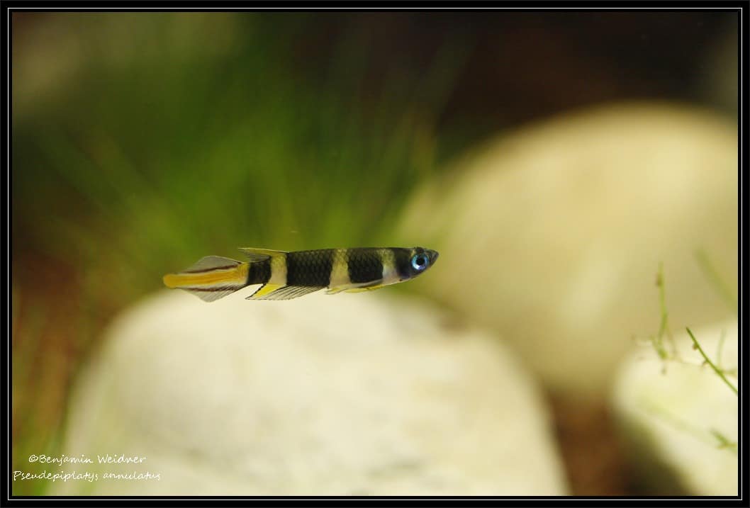 In Aquarien besticht Pseudepiplatys annulatus CONAKRY – Ringelhechtling durch leuchtende, ringförmige Bänder und dynamische Schwimmbewegungen. Sein aktives Sozialverhalten und die elegante Silhouette machen ihn zu einem außergewöhnlichen Gemeinschaftsfisch, der liebevolle Pflege verdient.