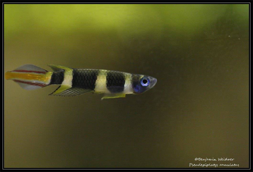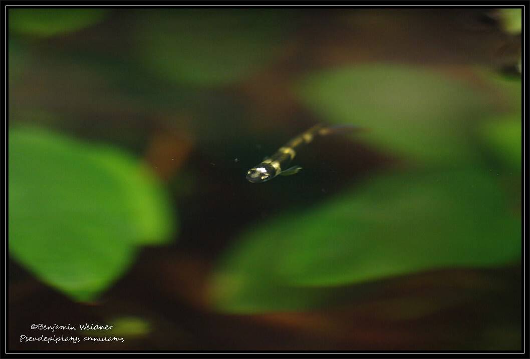 Pseudepiplatys annulatus, der Ringelhechtling Conakry, gehört zur Ordnung Cyprinodontiformes und zur Familie Nothobranchiidae. Der Fisch erreicht im Schnitt eine Länge von etwa 5 cm. Sein schlanker Körper zeigt feine, ringförmige Muster, die ihm auch seinen gebräuchlichen Namen verleihen. Die Farben sind meist dezent, mit hellen und dunklen Streifen, die variieren können. In seinem natürlichen Lebensraum lebt er in flachen, pflanzenreichen Gewässern in der Nähe von Flussmündungen in Westafrika, wie etwa bei Conakry. Dort bieten dichtere Ufervegetationen Schutz und Nahrung. Er zeigt ein territoriales Verhalten und reagiert blitzschnell auf Annäherungen von Artgenossen oder Fressfeinden. Zusätzlich hat er Anpassungen entwickelt, die ihm helfen, in sauerstoffarmen Gewässern zu überleben. Im Aquarium bevorzugt man Wasser mit einer Temperatur von durchschnittlich 26 °C und einem pH-Wert von rund 7. Dabei ist eine dichte Bepflanzung wichtig. Einige Messwerte können schwanken, weshalb manche Angaben uneinheitlich erscheinen.