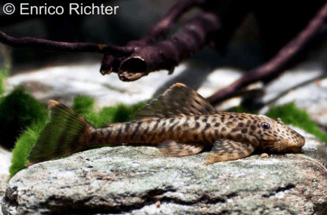 Pseudolithoxus dumus (L 244) überzeugt mit schlankem Körper und dezent getarnten Mustern. Der Fisch zeigt ein ruhiges, territorial geprägtes Verhalten, sucht zahlreiche Rückzugsorte und reinigt den Bodengrund mit seinem ausgeprägten Saugsystem.