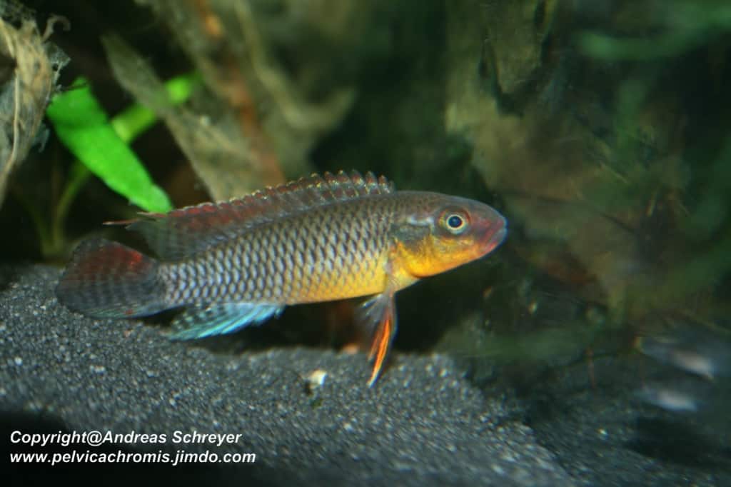 Männchen zeigen deutlich verlängerte, fadenartige Fortsätze an den Flossen – insbesondere an der Rücken- und Schwanzflosse – und wirken dabei farblich intensiver, während Weibchen insgesamt rundlicher gebaut sind und nur kurze, abgerundete Flossen ohne ausgeprägte filamentöse Ausläufer besitzen.