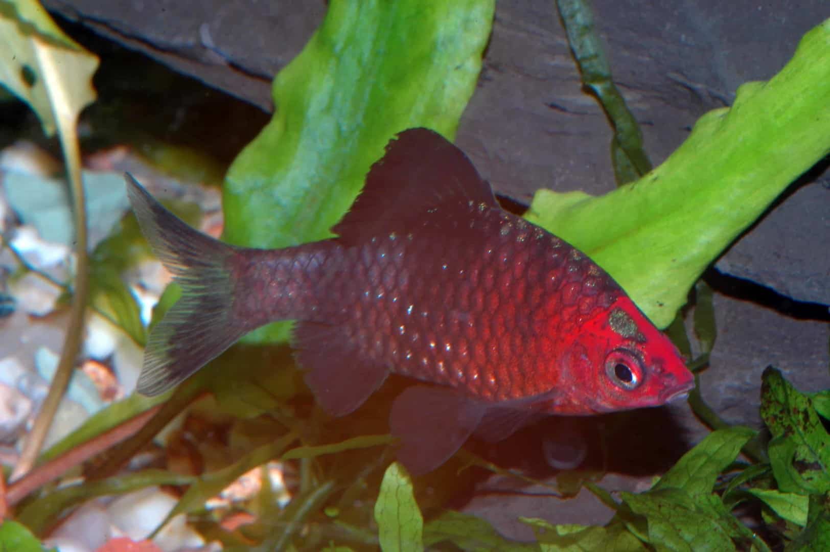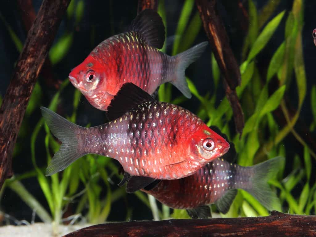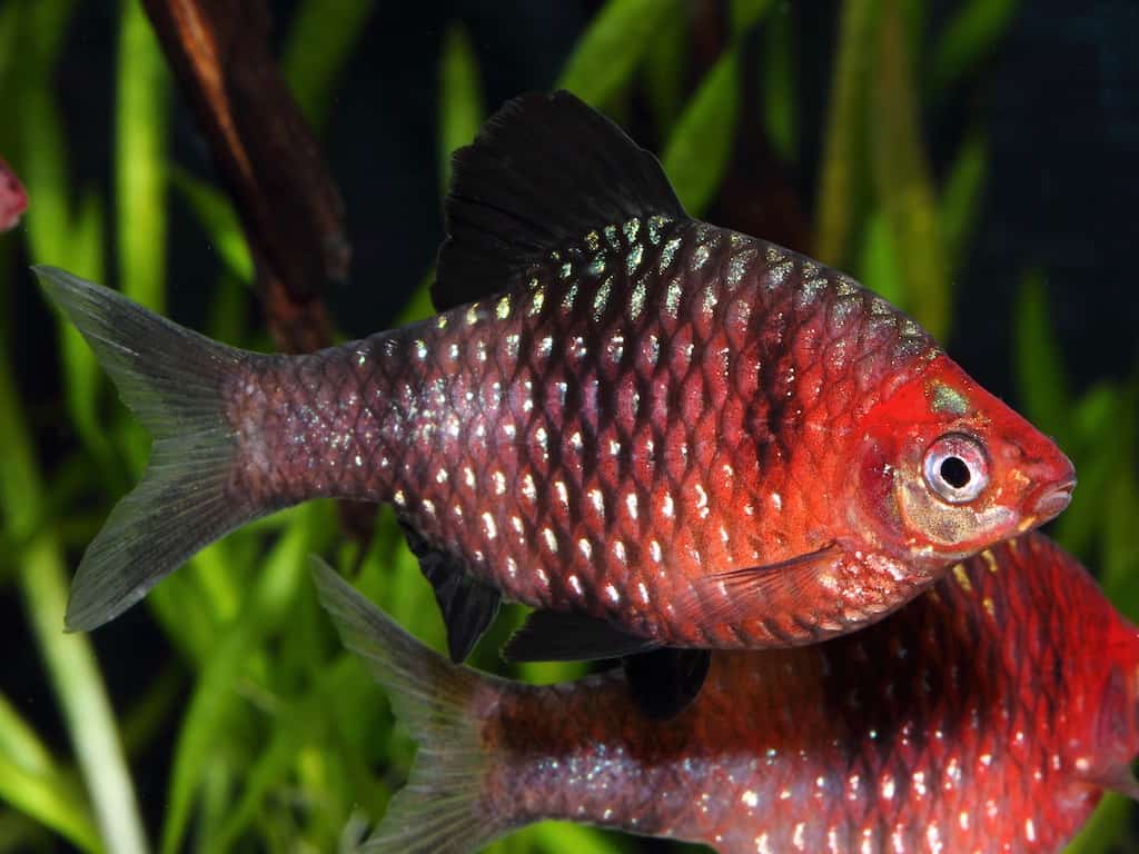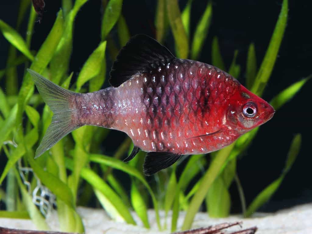 Pethia nigrofasciatus – Purpurkopfbarbe beeindruckt durch leuchtend purpurne Kopffärbung und feine schwarze Querstreifen. Ihr aktives Schwarmverhalten und friedliche Art machen sie zu einer charmanten Bereicherung im Gemeinschaftsaquarium.