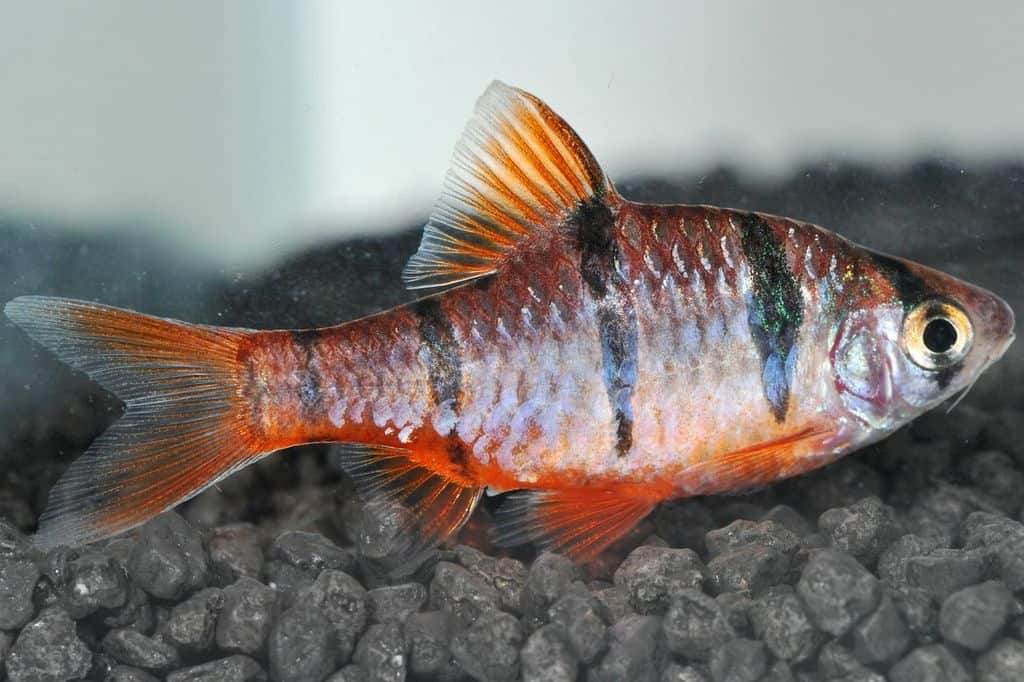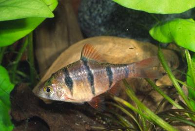 Weibchen der Fünfgürtelbarbe weisen im Vergleich zu den schlankeren Männchen einen runderen Bauchbereich auf – ein Unterschied, der besonders während der Laichperiode deutlich wird.