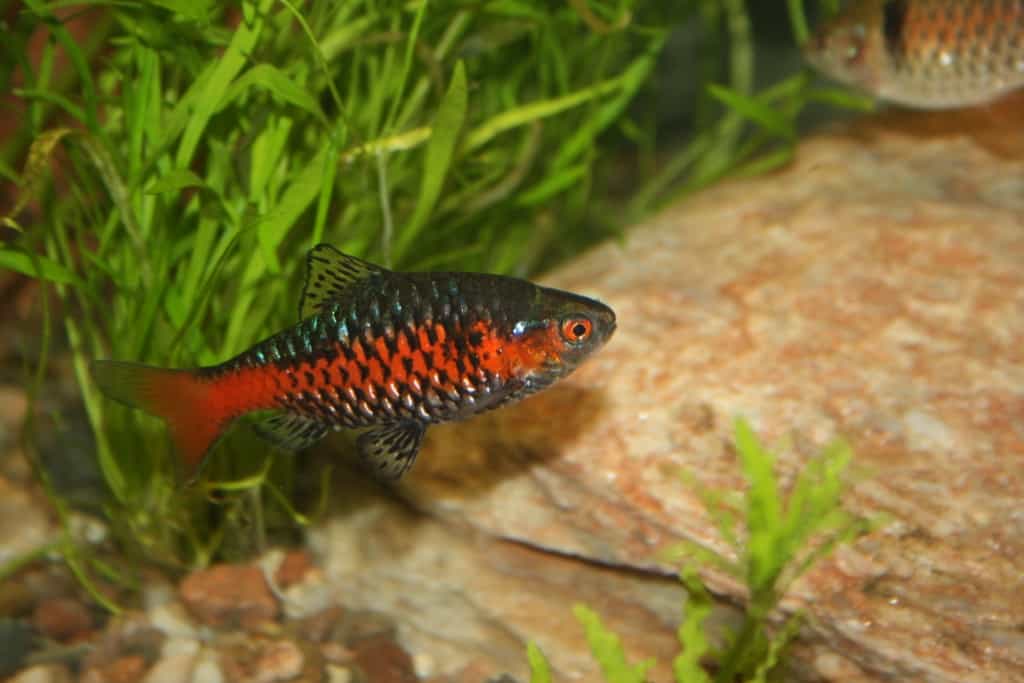 Männchen der Rubinbarbe zeigen vor allem während der Laichzeit eine intensivere Rotfärbung und neigen zu etwas längeren, schlankeren Flossen, während die Weibchen einen runderen, pralleren Körperbau besitzen – insbesondere wenn sie Eier tragen.