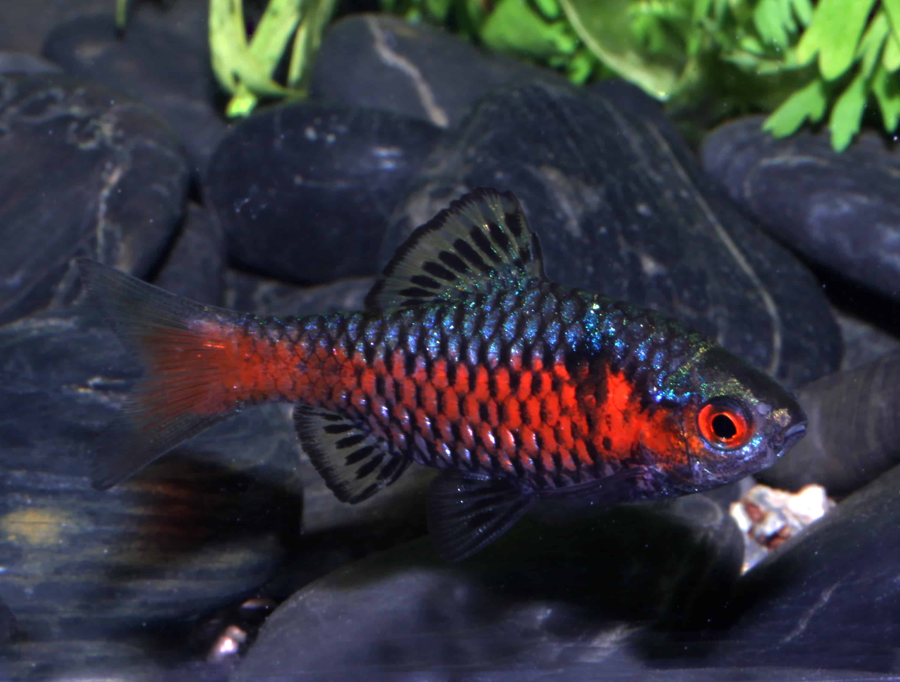 Pethia padamya – Rubinbarbe benötigt ein geräumiges, gut strukturiertes Gemeinschaftsaquarium mit zahlreichen Pflanzen, Verstecken und Schwimmräumen, um ihr natürliches Sozialverhalten zu unterstützen. Die Wasserparameter sollten konstant gehalten werden, idealerweise bei Temperaturen zwischen 24 und 26°C, einem pH-Wert von 6,5 bis 7,5 sowie einer ausreichenden Sauerstoffversorgung, wobei regelmäßige Teilwasserwechsel von etwa 20 bis 30 Prozent zur Stabilität beitragen. Eine leistungsstarke Filteranlage, abgestimmt auf das Volumen des Aquariums, hilft, Schadstoffe zu reduzieren und die Wasserqualität hoch zu halten. Die Ernährung sollte abwechslungsreich sein und sowohl qualitativ hochwertiges Trockenfutter als auch Frost- oder Lebendfutter umfassen, um die notwendigen Nährstoffe bereitzustellen. Zur Pflege gehört neben der regelmäßigen Reinigung von Bodengrund und Glasaquarium auch das Zurückschneiden zu kräftigen Pflanzenteile, um Algenwachstum und Verschmutzungen vorzubeugen und so ein artgerechtes Lebensumfeld für die Rubinbarben zu gewährleisten.
