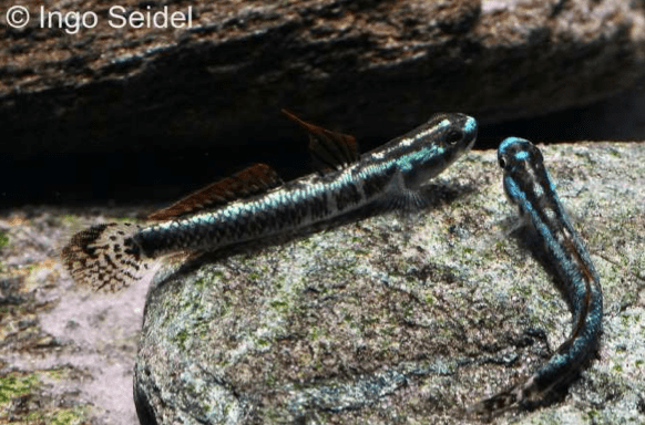 Stiphodon percnopterygonius, der Fähnchen-Neongrundel, beeindruckt mit leuchtenden Farben, schimmernden Flossen und feinen Mustern. Er zeigt aktives Algenscheer-Verhalten und nutzt felsige Rückzugsorte im Aquarium. Es sind keine besonderen Merkmale bekannt.