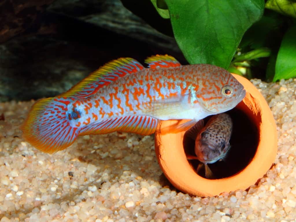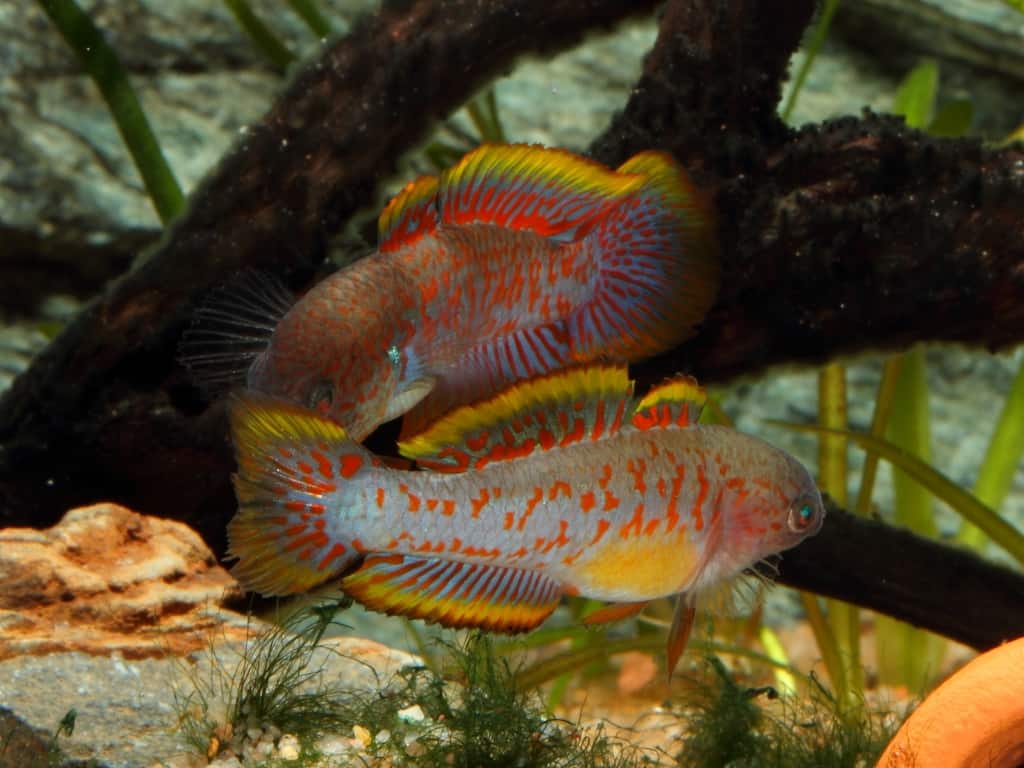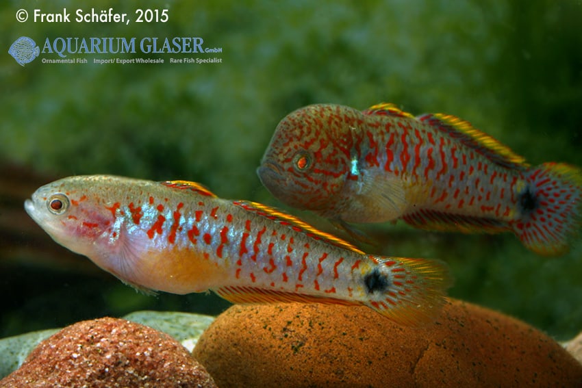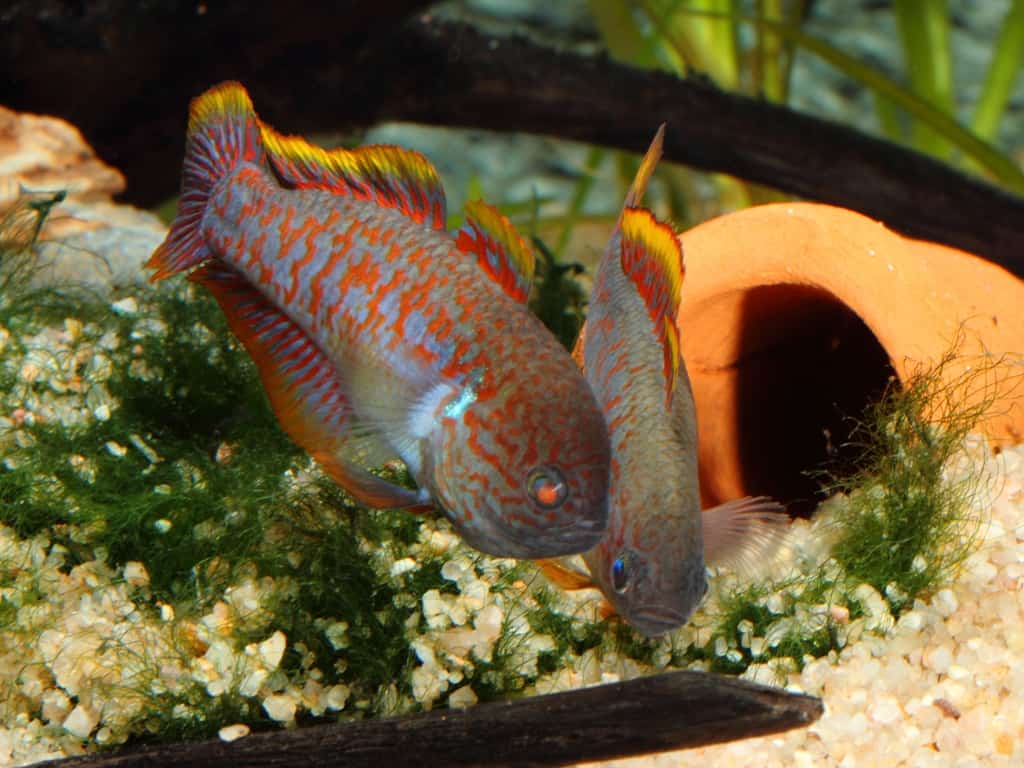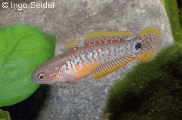 Männchen präsentieren bei Tateurndina ocellicauda eine lebhaft intensivere, pastellfarbene Färbung, die sich besonders in den verlängerten, spitz zulaufenden Flossen (etwa Rücken- und Afterflosse) sowie in einem ausgeprägten, oft ocellierten Schwanzmuster äußert. Weibchen erscheinen dagegen insgesamt blasser, mit kürzeren, eher abgerundeten Flossen und einem zurückhaltenderen Muster.