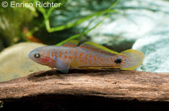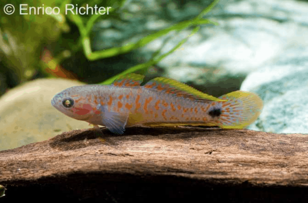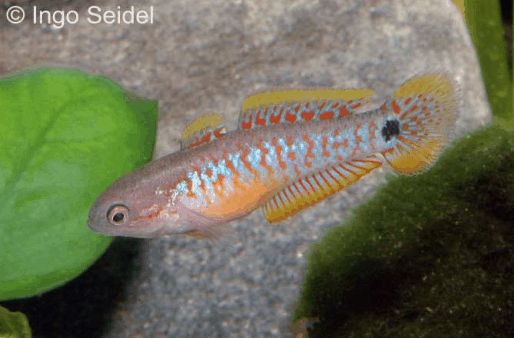 Tateurndina ocellicauda ist ein kleiner Fisch aus der Ordnung Perciformes. Sein wissenschaftlicher Name lautet Tateurndina ocellicauda. Der Körper ist schlank und misst im Schnitt 6 cm. Die Pastellfarben wechseln meist zwischen gelb und bläulich. Feine dunkle Flecken prägen den Rücken. Die Flossen sind zart und gleichmäßig geformt. Der Kopf ist klein mit leicht hervorstehenden Augen. Dieser Fisch bewohnt flache Wasserbereiche mit viel Licht. Er lebt in warmen, sauberen Fluss- und Bachläufen. In seinem natürlichen Lebensraum wirken Wasserpflanzen als Versteck und Nahrungslieferant. Zu den besonderen Verhaltensanpassungen zählt das schnelle Vergraben im Sand. Er zeigt ein territoriales Verhalten gegenüber Artgenossen. Eine zweite Anpassung ist seine Fähigkeit, bei geringem Sauerstoffgehalt aktiv zu bleiben. Im Aquarium hält man ihn gern in lauwarmem, klarem Wasser mit Temperaturen um 26 Grad. Pflanzen, Steine und Wurzeln bieten ihm wichtige Rückzugsmöglichkeiten. Angaben zu Größe und Wasserwerten schwanken, die Mittelwerte sind jedoch zuverlässig und beruhen auf aktuellen Quellen wie my-fish.org.