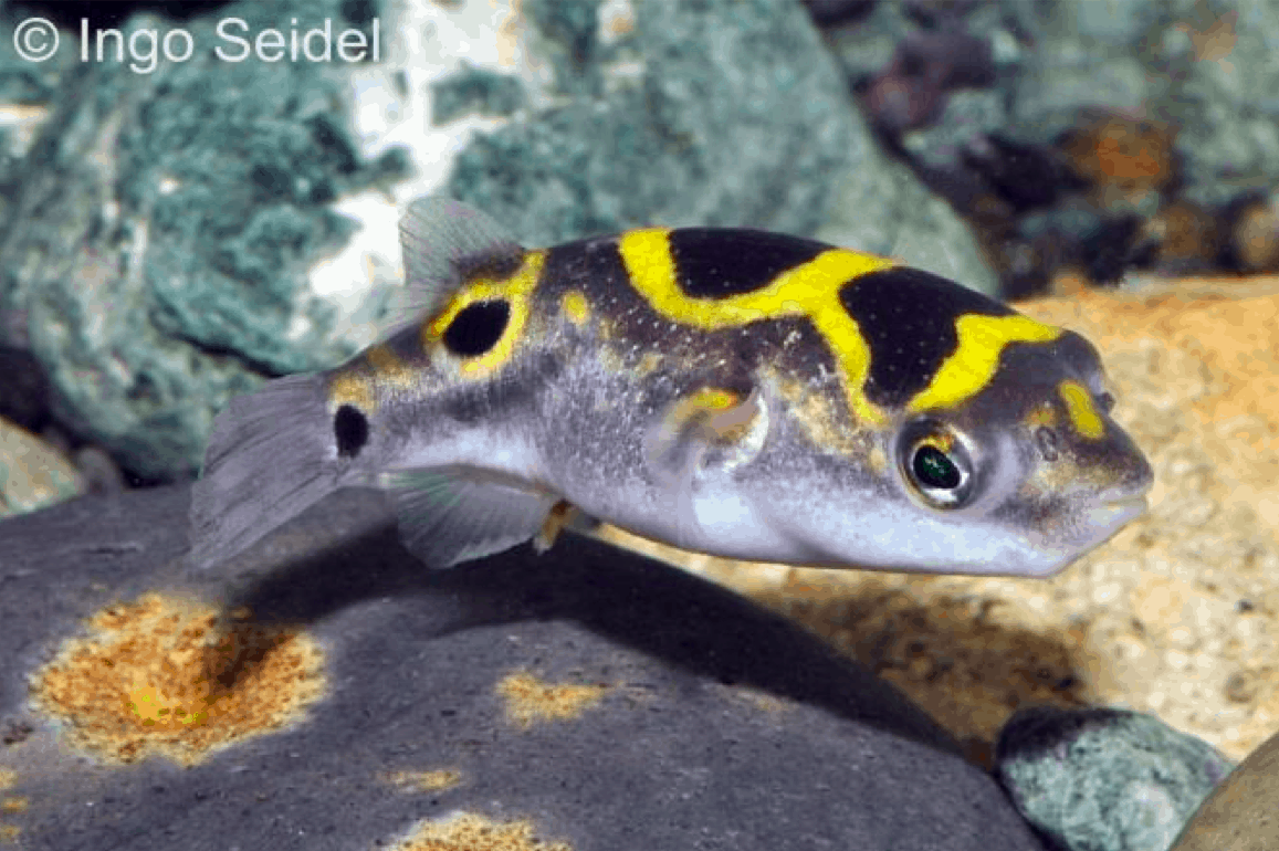 Dichotomyctere ocellatus (Palembang-Kugelfisch) gehört zur Familie der Kugelfische (Tetraodontidae). Die Art wird in Fachkreisen oft als Palembang-Kugelfisch bezeichnet. Der Fisch zeigt eine ovale Körperform und ist durchschnittlich ca. 18 cm lang. Die Haut weist dunkle Flecken und helle Augenflecken auf, die seine Art auszeichnen. Er hat kurze Flossen und einen breiten, flachen Kopf. Sein natürlicher Lebensraum liegt in langsam fließenden Süßwassergebieten in Südostasien, wo dichte Vegetation und weiche Böden vorherrschen. Er passt sich gut an wechselnde Wasserbedingungen und geringe Sauerstoffwerte an. Der Fisch reagiert empfindlich auf plötzliche Temperaturänderungen und zeigt ein ausgeprägtes Abwehrverhalten, etwa durch das Aufrichten der Flossen. Er ernährt sich von kleinen Wirbellosen, Krebstieren und Pflanzenresten, was seine Anpassungsfähigkeit zeigt. Im Aquarium benötigt er stabile Temperaturen von ca. 26 Grad Celsius und behutsame Pflege, um Stress zu vermeiden. Widersprüchliche Angaben bestehen zu den exakten Lebensraumdaten in freier Natur, so bleiben manche Details unsicher.