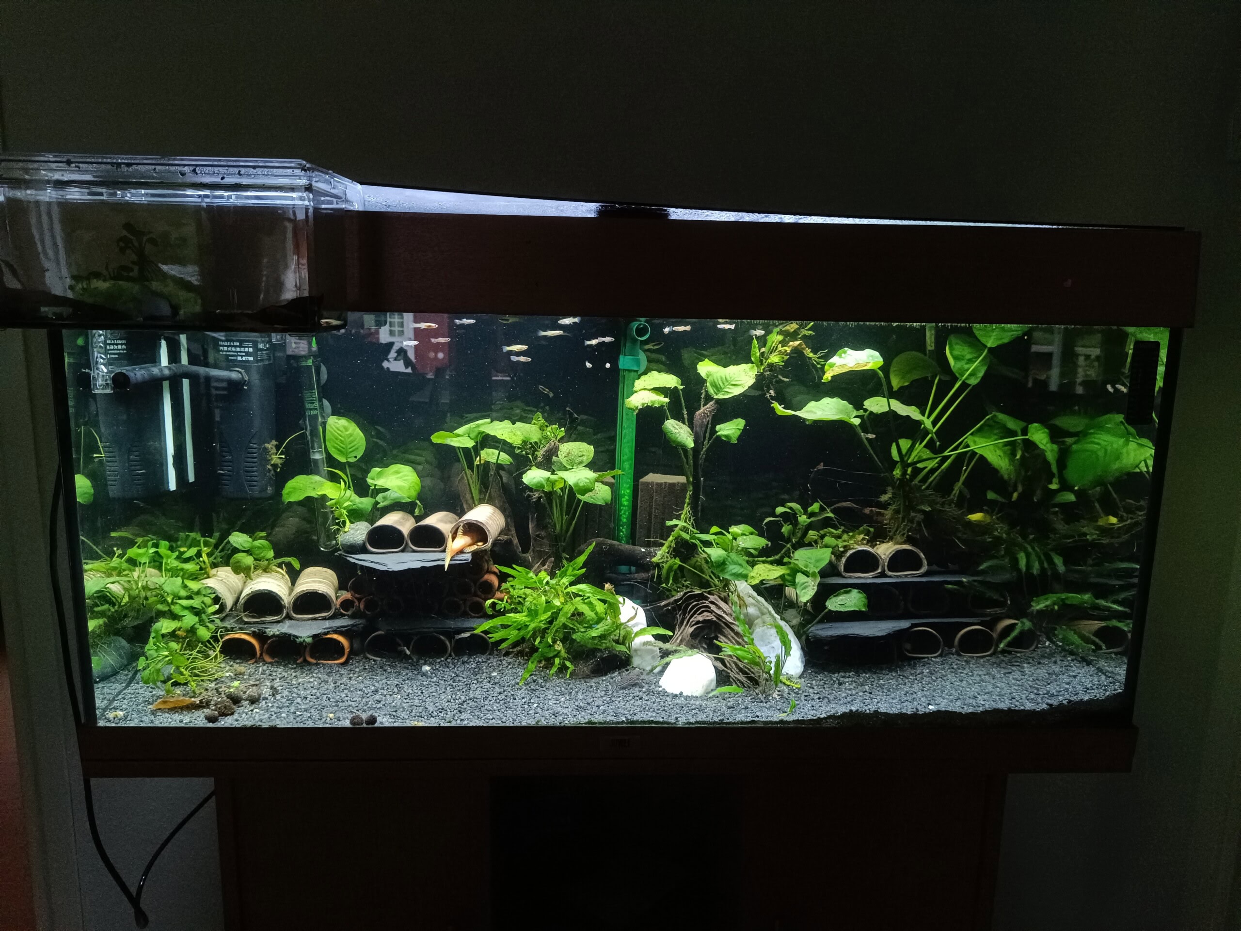 180L Becken (100x40x50cm) Filterung über leistungstarken kleinen Innenfilter (700L/Stunde) und einen Lufthebefilter Einrichtung: Gut strukturierte Einrichtung mit einer vielzahl an Wurzeln und Bruthöhlen aus Ton in leicht unterschiedlichen Größen (ca 10-12cm Länge, 3cm Höhe, 4-5cm Breite), Kies/Sand gemisch in schwarz als Bodengrund, Bepflanzung mit Anubien, Javafarn und anderen robusten Aufsitzerpflanzen Andere Beckenbewohner: Neocaridina sp. 'blue dream', Wildguppy-Hybridform Poecilia reticulata x Poecilia obscura, 5 Jungtiere aus vorherigem Gelege