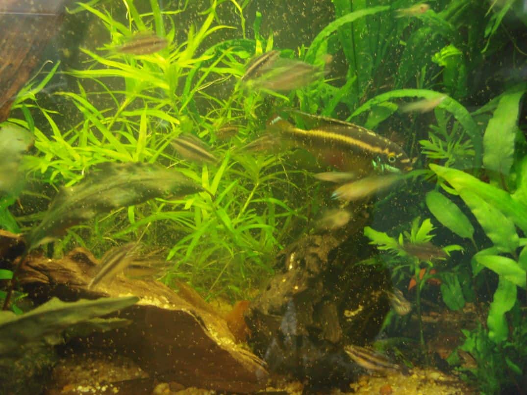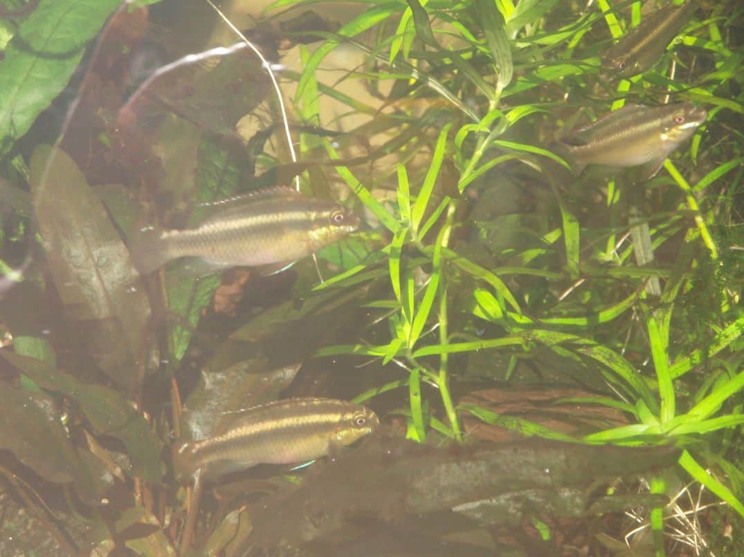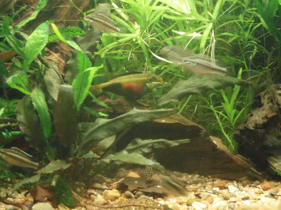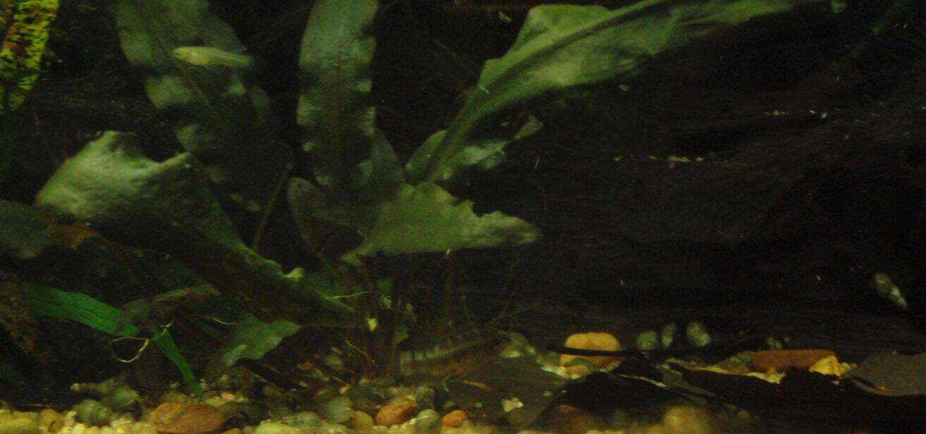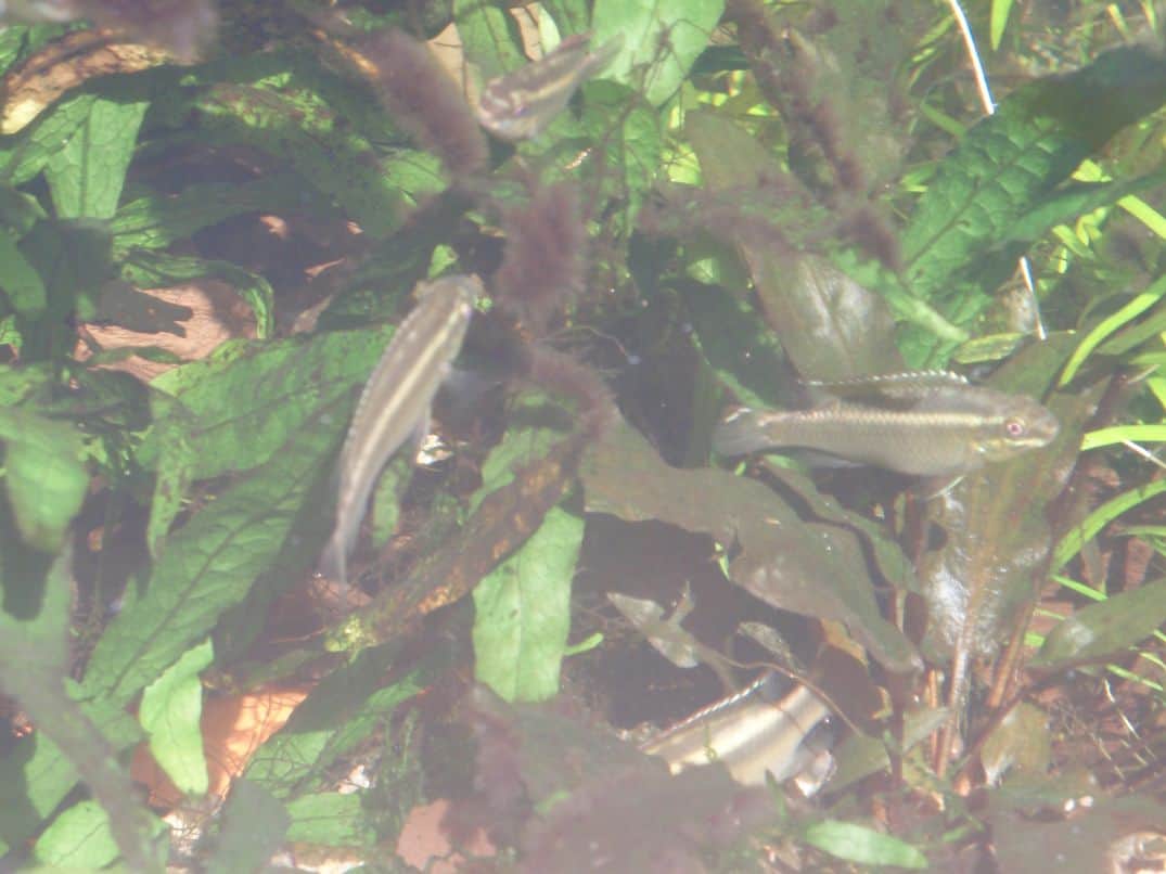 In den ersten 6 Wochen befürchtete ich tatsächlich, ein nicht harmonisierendes Paar erwischt zu haben: Er spielte sich als absoluter Chef im Becken auf und Sie bekam ich kaum zu sehen, und wenn dann deshalb, weil Er Sie durchs Becken jagte (was für das Weibchen aber wegen des dichten Beckenbewuchses nicht wirklich stressig war, so ein Verjagen war stets nach 1-3 Sekunden beendet). Ich würde meinen Beobachtungen nach Pelvicachromis sacrimontis nicht in kleineren Becken als einem Meter Länge pflegen bzw. züchten. Zum einen ist die Art aggressiver als P.pulcher, und wenn P. sacrimontis diese nicht an Feindfischen abarbeiten kann besteht die Gefahr, das sie es innerartlich, also am Partner tun. Und Feindfisch bedeutet, das dieser auch Platz und Gelegenheit zum Ausweichen braucht. Der Literatur ist weiterhin zu entnehmen, das diese Pelvicachromis-Art relativ empfindlich auf Störungen reagiert, was ich insofern bestätige, als das sie sich für Buntbarsch-Verhältnisse als recht scheue Sensibelchen ausnehmen können - was aber nicht heißt, das sie sich nicht Respekt zu verschaffen wüssten. Meine Geduld hatte sich aber gelohnt, denn irgendwann begann das Weibchen, den Attacken des Männchens nicht mehr auszuweichen und ihn stattdessen anzubalzen. Jetzt rechnete ich eigentlich ständig mit einem Gelege, doch so schnell gings dann aber doch nicht. Die beiden waren einfach wochenlang ein Herz und eine Seele (wieder: Für Buntbarsch-Verhältnisse) und die besten Kumpels, sonst aber nichts. Zumindest konnte ich nie ein Gelege bzw. entsprechendes Verhalten der inzwischen großen Tiere (m 11cm f 7cm) beobachten. Lediglich wurden ausgiebig verschiedene Stellen im Revier (sprich: Das ganze Becken) untersucht, geputzt und etwas gegraben, was aber nicht so weit geht als das sie Pflanzen ausbuddeln. Nach vier Wochen jedoch war ein deutlicher Verhaltensunterschied zu beobachten: Sie bewachte ein Gelege in einem kleinen auf der Seite liegend eingerabenen Blumentopf ohne Boden, und er bewachte die hinterste obere Ecke das Pflanzendickicht, in dem er saß und versuchte, IHR nicht ins Auge zu fallen, das Weibchen war sehr dominant und bewachte ihr Gelege (wie später auch die Brut) wie ein kleiner Derwisch (Ein weiterer Grund, in nicht zu kleinen Becken zu züchten). Dabei trägt das Weibchen nun ein Brutpflegekleid, das sensationell ist. Nachdem die Larven geschlüpft waren zog das Weibchen mit Ihnen noch zweimal um, was jedoch an meiner Neugierde gelegen haben könnte, denn ein bis zwei mal am Tag versuchte ich mit Hilfe einer Taschenlampe zu erkennen, was Stand der Dinge sei. Wie gesagt, P. sacrimontis reagiert sensibel auf Störungen. Deshalb beschränke ich alle Aktivitäten am und im Becken in der Zeit der Brutpflege (bis vier Wocchen nach Freischwimmen der Jungen) aufs Notwendigste. Nach elf Tagen (23°C) schwamm die Brut frei, und ab dem Zeitpunkt wurde das Männchen wieder geduldet, selbst in unmittelbarer Nähe der Brut, jedoch übernimmt er Pelvivachromis-typisch eher die Verteidigung der Reviergrenzen. Das besteht größtenteils darin, Angriffe auf die Feindfische zu schwimmen. Das tut das Weibchen gelegentlich auch, jedoch heftiger. Die Gelege-Größe ist relativ klein, je nach Kondition der Alttiere liegt sie bei 15-25 Jungfischen. Zu dem Verhältnis der Geschlechter-Verteilung (in Abhängigkeit der Temperatur) kann ich derzeit noch keine Aussage treffen - das kann ich vielleicht zu einem späteren Zeitpunkt aktualisieren. In den ersten beiden Wochen bekam ich die Jungfische kaum zu Gesicht, die von den Alten so durchs Becken geführt wurden, das sie stets in Deckung durch Wurzeln oder Pflanzen waren. In dieser Zeit füttere ich 4-5 mal am Tag mit frisch geschlüpften Artemien, die ich in die Nähe des Jungfischschwarms pipetiere - bzw. dahin, wo ich die Brut vermutete, die waren meistens in der entgegengesetzten Ecke wo sich die Hechtlinge aufhielten. Die Kleinen wachsen in den ersten Wochen deutlich, wenn sie ausreichend gefüttert werden. Da auf Dauer die Fütterung mit ausschließlich Artemia-Larven zu einseitig wird füttere ich mit Beginn der 3. Woche auch noch mit fein zerriebenem Flockenfutter und mit Frostfutter, das für Fischbrut gedacht ist. Da ist wohl auch jede Menge Artemia drin, aber auch Copepoden und andere Kleinstlebewesen. Durch die intensivere Fütterung nimmt natürlich auch die Belastung des Wassers zu, so das ich den Teilwasserwechsel (25-33%) zwei mal wöchentlich vornehme. Das ist übrigens bei den meisten Fisch-Nachzuchten sehr wichtig: Ich bringe die erfolgreiche Aufzucht von Fischbrut auf die einfache Formel: Sehr gut füttern (!) und häufig (regelmäsig) Teilwasserwechsel! Mit zunehmender Größe der Kleinen nimmt aber auch die Aggressivität der Alten zu, das Becken muß wirklich groß genug sein, das - in meinem Fall die Hechtlinge - die anderen Tiere ausweichen können. Ich denke das ich diesen Punkt wirklich nicht oft genug hervorheben kann, denn wenn die Alten nur noch auf die anderen Fische eindreschen wächst auch ihr Stress was in Extremo dazu führen kann, das sie ihre Brut nicht weiter betreuen! Ab einem Alter von sechs bis acht Wochen lässt der Brutpflegetrieb der Alttiere nach, und jetzt sollte man überlegen, ob man die Möglichkeit nutzt, die juvenilen Tiere zu separieren um sie gezielt füttern und aufziehen zu können, vielleicht ist es dem Wohlbefinden - und somit dem Wachstum - der Jungen abträglich, wenn sie immer mehr den Aggressionen der Alttiere ausgesetzt sind? Ich habe mich dazu entschieden, die juvenilen Tiere über diesen Zeitpunkt hinaus bei den Alten zu lassen, senke aber die Temperatur ab (Zimmer-Temp.), damit die Alten nicht direkt das nächste Brutgeschäft beginnen, was sie natürlich weniger aggressiv sein lässt. Es bekommt den Zuchttieren ohnehin besser, ihnen zwischen den Laichgeschäften Ruhe zu gönnen, das verbessert ihre Kondition und somit auch die der Nachzuchten. Die Mutter zeigt gelegentlich schon Aggressionen ge