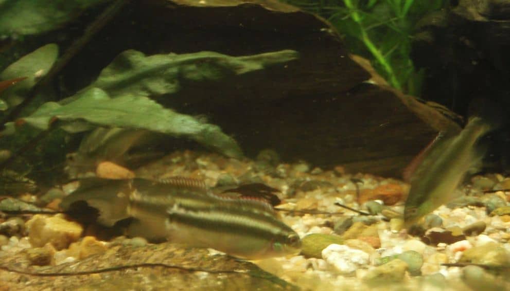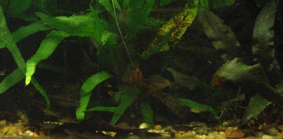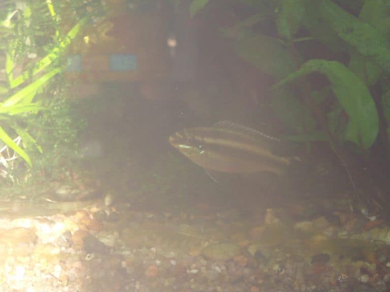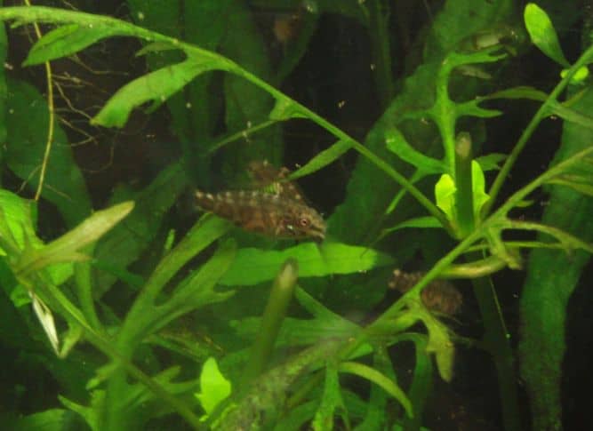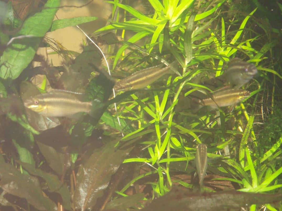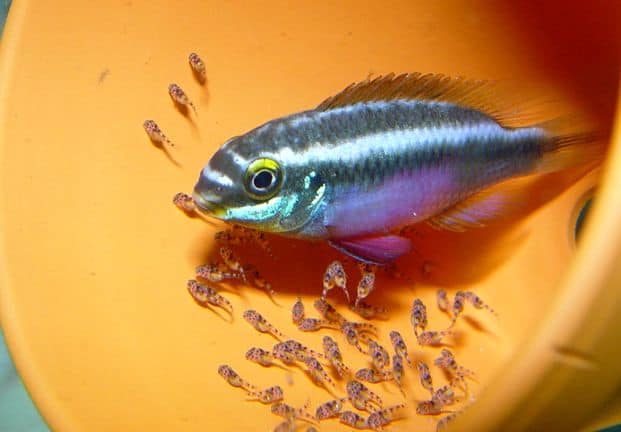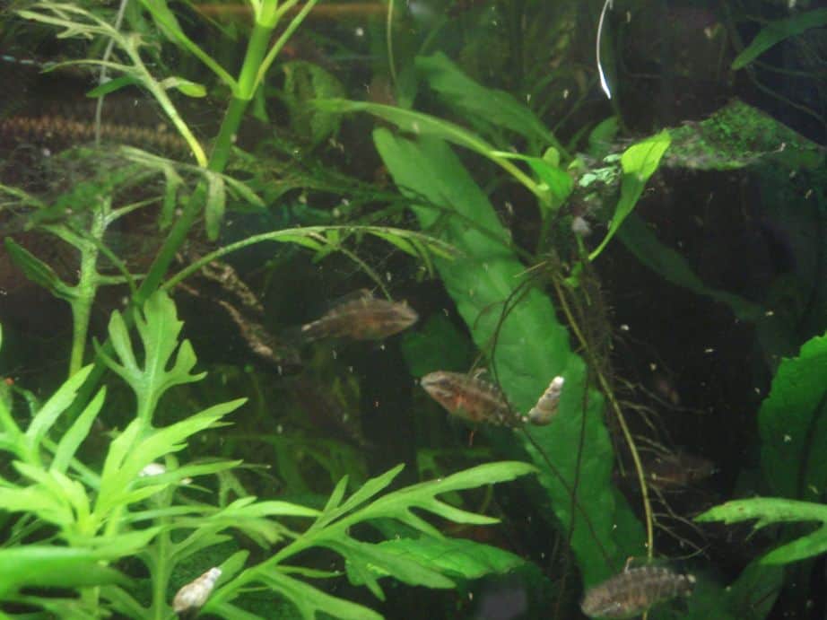 In den ersten 6 Wochen befürchtete ich tatsächlich, ein nicht harmonisierendes Paar erwischt zu haben: Er spielte sich als absoluter Chef im Becken auf und Sie bekam ich kaum zu sehen, und wenn dann deshalb, weil Er Sie durchs Becken jagte (was für das Weibchen aber wegen des dichten Beckenbewuchses nicht wirklich stressig war, so ein Verjagen war stets nach 1-3 Sekunden beendet). Ich würde meinen Beobachtungen nach Pelvicachromis sacrimontis nicht in kleineren Becken als einem Meter Länge pflegen bzw. züchten. Zum einen ist die Art aggressiver als P.pulcher, und wenn P. sacrimontis diese nicht an Feindfischen abarbeiten kann besteht die Gefahr, das sie es innerartlich, also am Partner tun. Und Feindfisch bedeutet, das dieser auch Platz und Gelegenheit zum Ausweichen braucht. Der Literatur ist weiterhin zu entnehmen, das diese Pelvicachromis-Art relativ empfindlich auf Störungen reagiert, was ich insofern bestätige, als das sie sich für Buntbarsch-Verhältnisse als recht scheue Sensibelchen ausnehmen können - was aber nicht heißt, das sie sich nicht Respekt zu verschaffen wüssten. Meine Geduld hatte sich aber gelohnt, denn irgendwann begann das Weibchen, den Attacken des Männchens nicht mehr auszuweichen und ihn stattdessen anzubalzen. Jetzt rechnete ich eigentlich ständig mit einem Gelege, doch so schnell gings dann aber doch nicht. Die beiden waren einfach wochenlang ein Herz und eine Seele (wieder: Für Buntbarsch-Verhältnisse) und die besten Kumpels, sonst aber nichts. Zumindest konnte ich nie ein Gelege bzw. entsprechendes Verhalten der inzwischen großen Tiere (m 11cm f 7cm) beobachten. Lediglich wurden ausgiebig verschiedene Stellen im Revier (sprich: Das ganze Becken) untersucht, geputzt und etwas gegraben, was aber nicht so weit geht als das sie Pflanzen ausbuddeln. Nach vier Wochen jedoch war ein deutlicher Verhaltensunterschied zu beobachten: Sie bewachte ein Gelege in einem kleinen auf der Seite liegend eingerabenen Blumentopf ohne Boden, und er bewachte die hinterste obere Ecke das Pflanzendickicht, in dem er saß und versuchte, IHR nicht ins Auge zu fallen, das Weibchen war sehr dominant und bewachte ihr Gelege (wie später auch die Brut) wie ein kleiner Derwisch (Ein weiterer Grund, in nicht zu kleinen Becken zu züchten). Dabei trägt das Weibchen nun ein Brutpflegekleid, das sensationell ist. Nachdem die Larven geschlüpft waren zog das Weibchen mit Ihnen noch zweimal um, was jedoch an meiner Neugierde gelegen haben könnte, denn ein bis zwei mal am Tag versuchte ich mit Hilfe einer Taschenlampe zu erkennen, was Stand der Dinge sei. Wie gesagt, P. sacrimontis reagiert sensibel auf Störungen. Deshalb beschränke ich alle Aktivitäten am und im Becken in der Zeit der Brutpflege (bis vier Wocchen nach Freischwimmen der Jungen) aufs Notwendigste. Nach elf Tagen (23°C) schwamm die Brut frei, und ab dem Zeitpunkt wurde das Männchen wieder geduldet, selbst in unmittelbarer Nähe der Brut, jedoch übernimmt er Pelvivachromis-typisch eher die Verteidigung der Reviergrenzen. Das besteht größtenteils darin, Angriffe auf die Feindfische zu schwimmen. Das tut das Weibchen gelegentlich auch, jedoch heftiger. Die Gelege-Größe ist relativ klein, je nach Kondition der Alttiere liegt sie bei 15-25 Jungfischen. Zu dem Verhältnis der Geschlechter-Verteilung (in Abhängigkeit der Temperatur) kann ich derzeit noch keine Aussage treffen - das kann ich vielleicht zu einem späteren Zeitpunkt aktualisieren. In den ersten beiden Wochen bekam ich die Jungfische kaum zu Gesicht, die von den Alten so durchs Becken geführt wurden, das sie stets in Deckung durch Wurzeln oder Pflanzen waren. In dieser Zeit füttere ich 4-5 mal am Tag mit frisch geschlüpften Artemien, die ich in die Nähe des Jungfischschwarms pipetiere - bzw. dahin, wo ich die Brut vermutete, die waren meistens in der entgegengesetzten Ecke wo sich die Hechtlinge aufhielten. Die Kleinen wachsen in den ersten Wochen deutlich, wenn sie ausreichend gefüttert werden. Da auf Dauer die Fütterung mit ausschließlich Artemia-Larven zu einseitig wird füttere ich mit Beginn der 3. Woche auch noch mit fein zerriebenem Flockenfutter und mit Frostfutter, das für Fischbrut gedacht ist. Da ist wohl auch jede Menge Artemia drin, aber auch Copepoden und andere Kleinstlebewesen. Durch die intensivere Fütterung nimmt natürlich auch die Belastung des Wassers zu, so das ich den Teilwasserwechsel (25-33%) zwei mal wöchentlich vornehme. Das ist übrigens bei den meisten Fisch-Nachzuchten sehr wichtig: Ich bringe die erfolgreiche Aufzucht von Fischbrut auf die einfache Formel: Sehr gut füttern (!) und häufig (regelmäsig) Teilwasserwechsel! Mit zunehmender Größe der Kleinen nimmt aber auch die Aggressivität der Alten zu, das Becken muß wirklich groß genug sein, das - in meinem Fall die Hechtlinge - die anderen Tiere ausweichen können. Ich denke das ich diesen Punkt wirklich nicht oft genug hervorheben kann, denn wenn die Alten nur noch auf die anderen Fische eindreschen wächst auch ihr Stress was in Extremo dazu führen kann, das sie ihre Brut nicht weiter betreuen! Ab einem Alter von sechs bis acht Wochen lässt der Brutpflegetrieb der Alttiere nach, und jetzt sollte man überlegen, ob man die Möglichkeit nutzt, die juvenilen Tiere zu separieren um sie gezielt füttern und aufziehen zu können, vielleicht ist es dem Wohlbefinden - und somit dem Wachstum - der Jungen abträglich, wenn sie immer mehr den Aggressionen der Alttiere ausgesetzt sind? Ich habe mich dazu entschieden, die juvenilen Tiere über diesen Zeitpunkt hinaus bei den Alten zu lassen, senke aber die Temperatur ab (Zimmer-Temp.), damit die Alten nicht direkt das nächste Brutgeschäft beginnen, was sie natürlich weniger aggressiv sein lässt. Es bekommt den Zuchttieren ohnehin besser, ihnen zwischen den Laichgeschäften Ruhe zu gönnen, das verbessert ihre Kondition und somit auch die der Nachzuchten. Die Mutter zeigt gelegentlich schon Aggressionen ge