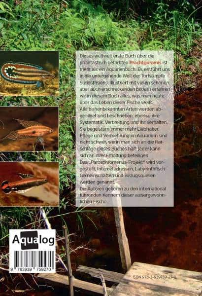 Die phantastisch gefärbten Prachtguramis begeistern immer mehr Aquarianer. Dieses erste Handbuch über diese Fische ist nicht nur ein Aquarienbuch – es ist anders: Es führt den Leser, illustriert mit schönen aber auch erschreckenden Bildern in den Urwald und zu den Torfsümpfen Malaysias und Indonesiens. Prachtguramis sind erste Indikatoren für die untergehenden tropischen Schwarzwasserlebensräume, sie sind bereits heute hochgradig existenzbedroht. Prachtguramis sind ökologisch hochspezialisiert. Aus der Analyse ihrer Lebensbedingungen kann der Leser Schlüsse für Haltung und Vermehrung ableiten. Pflege und Zucht im Aquarium ist nicht schwer, wenn man sich an die verständlich dargelegten Ratschläge dieses Buches hält. Alle Arten und Farbformen werden beschrieben und mit einmaligem Bildmaterial vorgestellt. Systematik und geographische Verbreitung werden ausführlich betrachtet. Auch das komplexe Verhalten der Paros wird erläutert und mit zahlreichen Fotografien dokumentiert. Das internationale Erhaltungs-Netzwerk „Parosphromenus-Projekt“ wird vorgestellt, weitere Labyrinthfisch-Gemeinschaften und Bezugsquellen für Paros werden genannt. In diesem Buch erfährt der Leser alles, was er über Prachtguramis wissen sollte. Die Autoren gehören zu den international führenden Kennern dieser Fische.