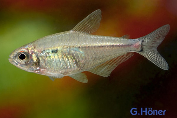 Der Blutschwanzsalmler trägt seinen Namen aufgrund des kräftig roten Fleckes auf der Schwanzwurzel, der vor allem bei Männchen früh sichtbar wird. Der restliche Körper ist farblos, bis auf einen schwarzen Fleck auf der Schulter. Meist wird diese Art versehentlich als Beifang zum Beispiel bei Rotkopfsalmlern oder Roten Neon importiert und wird aufgrund der schlichten Färbung selten gezielt angeboten. Dennoch ist diese Art ein schöner Hingucker, wenn sich die Rotfärbung voll entwickelt hat. Vorraussetzung dafür sind gut eingewöhnte Tiere in einem nicht zu grell beleuchteten Aquarium mit ausreichend Versteckmöglichkeiten.