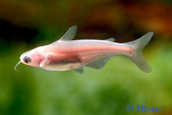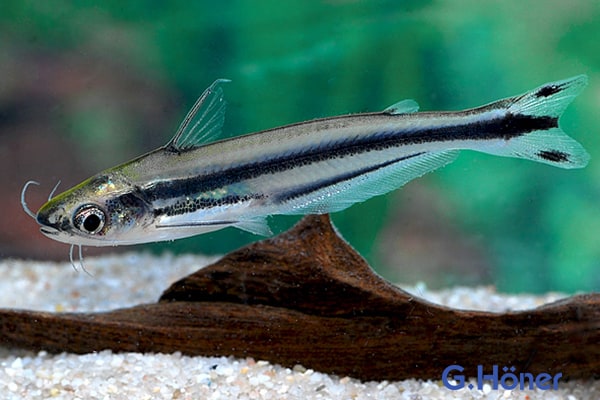 Charakteristisch für den Pareutropius buffei ist der durchscheinende Körper und das schwarze Streifenmuster. Es handelt sich um einen sehr agilen Fisch, der auf der Suche nach Futter gerne das Becken durchstreift.