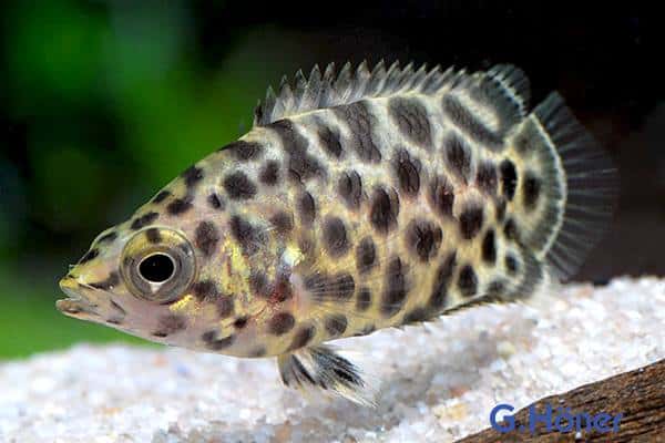 Der Leopard-Buschfisch jagd des Nachts. Er verharrt bewegungslos und saugt vorbeischwimmende kleine Fische mit dem Wassersog, der entsteht, wenn er blitzschnell sein Maul öffnet, ein. Er kann jedoch problemlos mit Frostfutter ernährt werden.