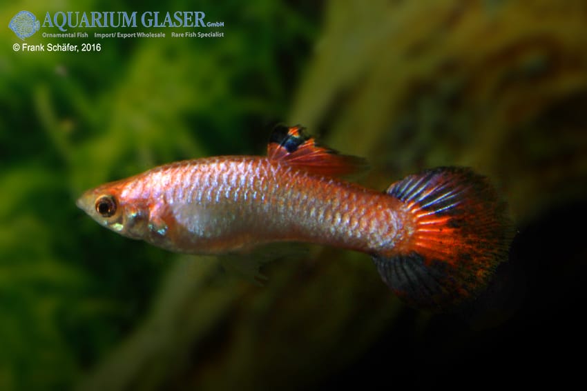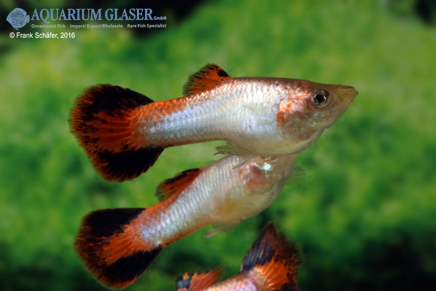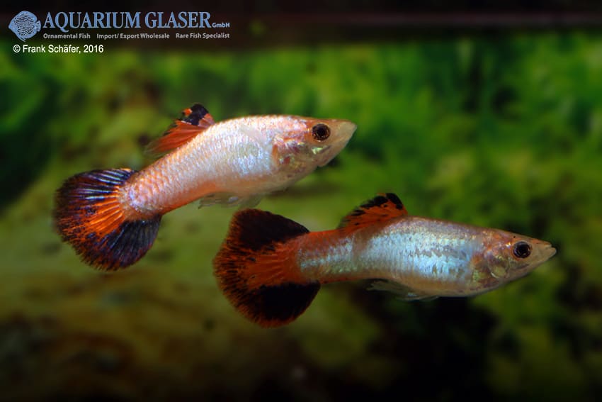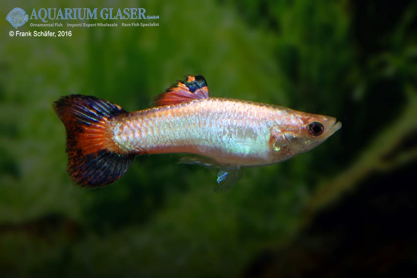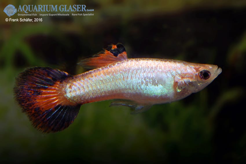 Diese neuen Farbzuchten des Rundschwanz-Guppys stammen aus Sri Lanka. Die Körperfarbe ist silberblau. Die Schwanzflosse ist bei idealen Tieren farblich dreigeteilt, oben und unten schwarz, in der Mitte flammend rot.