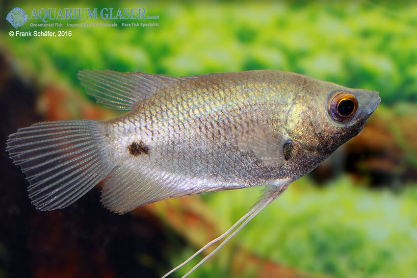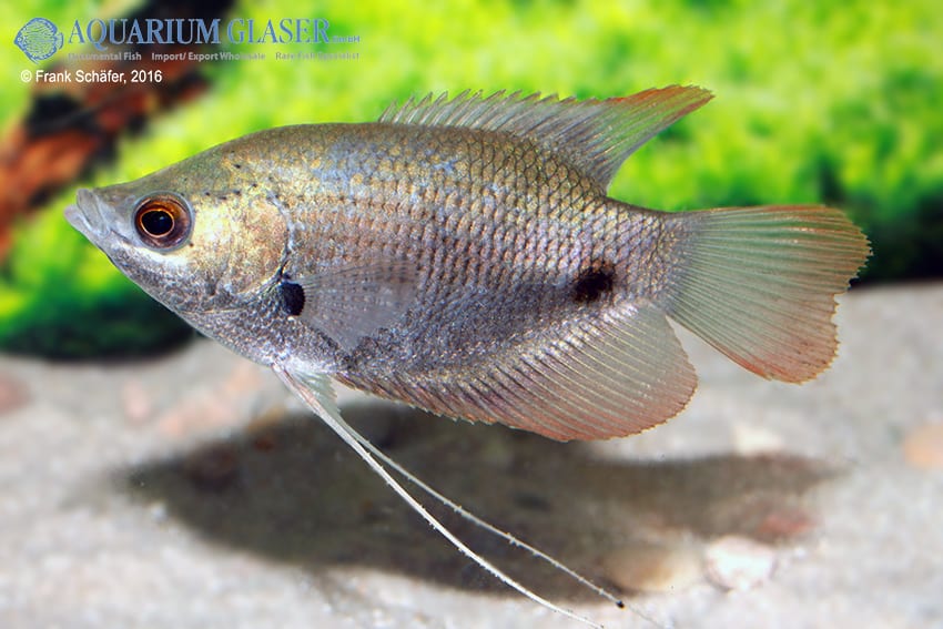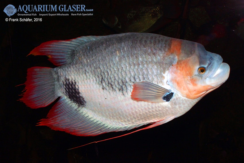 Der Unterschied ist immens. Glaser hat den seltenen, rotflossigen Riesengurami in zwei Größen erhalten, 5-7 cm und 12-15 cm. Wie der gewöhnliche Riesengurami wird auch diese Art um 60 cm lang. Oben sieht man die ausgewachsenen Tiere im Vergleich zu den Jungtieren (unten). Die Heimat des Fisches liegt auf Borneo. Die erwachsenen Männchen entwickeln eine ausgeprägte Physiognomie und tiefrote Flossen, die herrlich mit dem schwarzen Körper kontrastieren. Die Bilder der ausgewachsenen Tiere zeigen, dass O. laticlavius ein prachtvoller Schaufisch für Großaquarien ist.